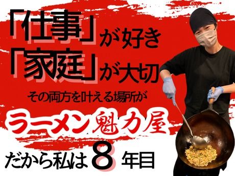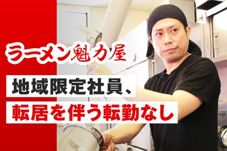 仕事内容 <<<女性社員が活躍中♪>> 上場企業、魁力屋の「大宣言!」 (。・ω・)σ働きやすさに“自信あり”! ・:・:・:・:・:・:・:・:・:・:・:・:・:・:・:・:・ 。.☆。女性が活躍中の理由は…。☆.。 ▼ 【1位】家庭&育児に理解あり! 【2位】性別問わずキャリアUP 【3位】道具が使いやすい! ・:・:・:・:・:・:・:・:・:・:・:・:・:・:・:・:・ ★【育児に理解あります!!】 1店舗に“2~3名”の社員を配置 子育て中の方に配慮しています。 [子育て支援]土日休み考慮 [週休二日制]月9日休み [産休育休有]女性取得100% ★【キャリアUPできます!!】 居住地を変えずに働ける 地域限定社員でも、店長就任OK! 女性店長の割合は約20%! まだまだ増やしていきます♪ ★【道具が使いやすい!!】 大きすぎないお鍋や カウンターも低めに設定! 力仕事も極力排除しています。 ┏━━━━━━━━━━━━★┓ 【産休・育休取得率100%】 復帰後はなるべく近い店舗へ 夕方までのシフトなど考慮! お子さんの休日に合わせて 土日祝日休みも配慮します◎ ┗★━━━━━━━━━━━━┛ [時間帯責任者の年収407万円~] ※月給26万5000円~ [地域限定・店長の年収550万円~] ※月給28万5000円~ ★2023年の賞与支給実績★ スタッフ・リーダー職:約57万円 時間帯責任者:約64万円 店長:約75万円 年2回の季節賞与に加えて、 会社の業績が良い場合は決算賞与も支給! <仕事内容> ラーメン店のスタッフのお仕事。 [ホール・接客業務・食材の仕込み・調理] 将来的には店長になるのもアリ♪ [スタッフ採用・育成・店舗の運営・管理] ↓↓(●´∀`)子育て中の社員より♪ ____________ !こんな人です!  ̄V ̄ ̄ ̄ ̄ ̄ ̄ 【地域限定職・7年9ヵ月】 中2女の子と小5男の子のママさん 趣味は…PTAのバトミントン - - - - - - - - - - - - - - - - - - - -♪彡: もともとアルバイトで入社しました。 子どもが成長するにつれて もっと稼ぎたくなり地域限定社員に! 子育て中の社員への配慮はバッチリで 土日のお休みももらえることも多いです。 特に子どもが小さいころは、 「急な発熱…」なんて時も周りの皆が サポートしてくれる体制が整っています。 肩身が狭いなんてこともなく、 皆、笑顔で協力してくれるんです。 ライフプランに合わせて、 働き方を相談させてもらいながら 今後も長く働いていきたいと思います。 【プチ情報】 好きなポジションは焼き飯 (嫌いだったんですが、今は一番好き!w 振り続けていくとコツがわかり上手に♪) ※写真の焼き飯を作ってるのは私ですww ↓↓採用担当者は…ヾ(○'▽'○)ノ ____________ !こんな人です!  ̄V ̄ ̄ ̄ ̄ ̄ ̄ 【人事責任者(36歳 男性】 - - - - - - - - - - - - - - - - - - - -♪彡: 応募者全員と面接します! 面接とは言っても、楽しく お話をする場だと思ってください。 服装もいつもの服装でOK! 会社とともに一緒に成長しませんか? 働き方に不安があれば面接時に何でも 相談してくださいね。 お待ちしています♪ 【プチ情報】 [好きなメニュー] 特製醤油味玉ラーメンの固麺! [趣味] 子どもと休日に公園へ行って すべり台で遊びます! 消防車をみにいくことも。 ▼飲食経験がないあなたでも!▼ 【キャリアパス制度】が明確だから 【最短1年】で店長が目指せます! step1.「ホール業務全般を覚える」 step2.「サイドメニューの調理ができる」 step3.「麺場の切り盛りができる」 …と段階を踏んで、仕事を一つずつマスター。 仕事の幅を確実に広げられます! ゆくゆくは、【人を育てる】業務もお任せします。