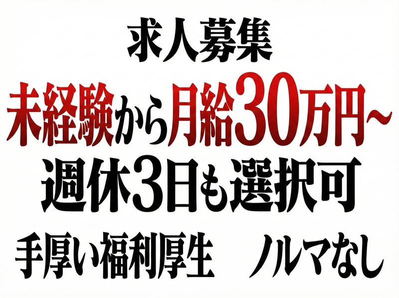 選考プロセス ✅ 条件を満たす方、全員と面接します! 以下の条件をクリアしている方は「面接確約」です。 ・普通自動車免許(AT限定可)をお持ちの方 ・45歳以下の方(長期勤続によるキャリア形成のため) ・応募時に履歴書・職務経歴書のデータ提出ができる方 ※書類はまずは簡易的なものでも構いません。 【選考の流れ】 ①応募 「簡単ネット応募」または「お電話」にて。 ②面接(1〜2回) これまでの経験よりも、あなたの「これから」を重視します。 リラックスして、理想の働き方についてお聞かせください。 ③内定・入社 入社時期は柔軟に相談に応じます。 お電話での直接応募・相談も受付中! 03-5856-9870(総合受付 9:30〜19:00) 「求人を見た」とお伝えいただくとスムーズです。