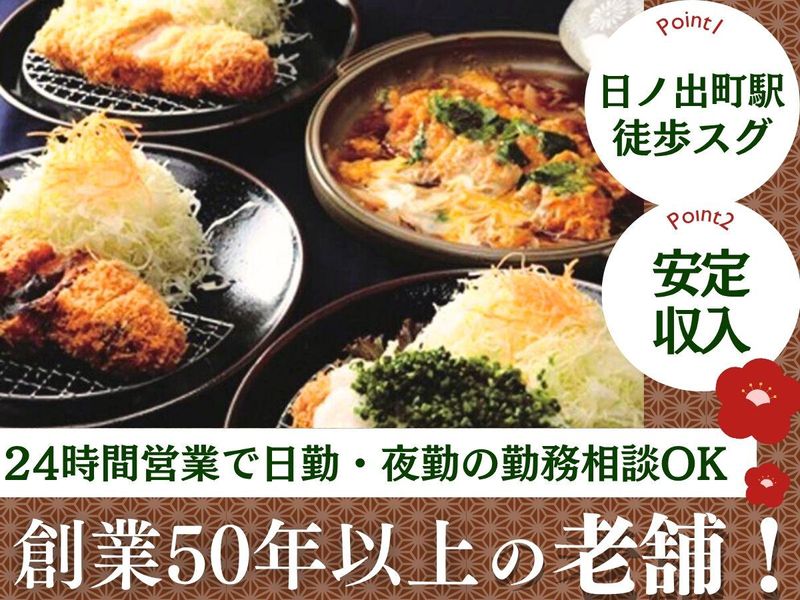 仕事内容 ✨4月から働く学生も歓迎します✨ 土日祝勤務できる方募集! 早朝・ランチ・ディナーなど、 お好きな時間で働けます! ライフスタイルに合わせて勤務可能♪ 【仕事内容】 24時間営業のとんかつと和食のお店にて ホールスタッフの業務をお願いします。 ✅お客様のご案内 ✅注文伺い等のホール他 ✅タブレットによる打ち込み …などをお任せします。 【おすすめPOINT】 ⭐早朝・ランチ・ディナー・土日のみも可 ⭐長期勤務大歓迎 ⭐週2・3日~OK!1日4時間~OK! ⭐ウレシイまかない有り! ⭐Wワーク・短期スタートもOK✨ ⭐電話応募も大歓迎<045-251-8888> ―――――――――――――――― \✨24時間営業✨/ 希望の時間帯に働けることもあり、 ワークライフバランスを大切にしながら 自分らしく働ける環境が整っています。 家事や育児と両立して ランチに働く主婦パートさんや、 早朝や夕方などの短時間勤務で 学業や副業と両立する学生さんなど 幅広い年代の方が活躍中です! 【港町横濱の発展と共に創業58年】 みなとみらいや馬車道、横浜中華街など 観光に訪れる方にも人気の港町横濱エリア。 創業58年と老舗ではありますが、 2018年にリニューアルし 明るくキレイな店舗になりました。 地元の方にも愛されており、 昼夜問わず大人気♪ お子様用の席を準備したり、 会食などにも使える個室があったりと、 幅広いお客様のニーズにお応えしています。