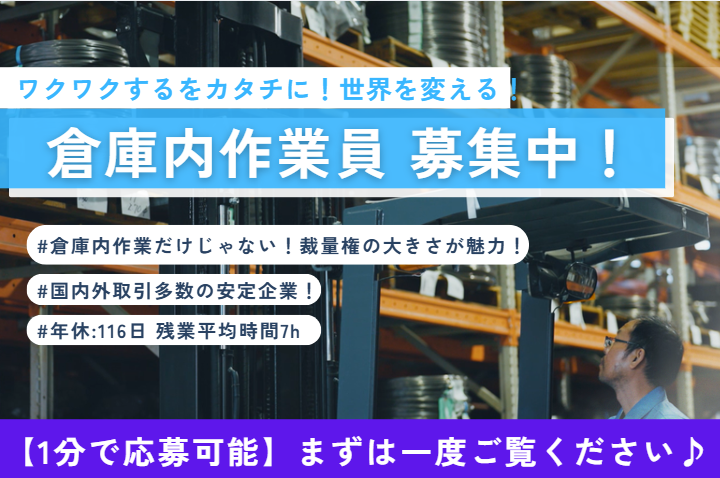 求めている人材 ⏩必須条件 ・下記資格をお持ちの方 └フォークリフト運転技能者 └普通運転自動車免許 ✅歓迎条件 ♦人と話すことが好きな方 ♦倉庫での勤務経験がある方 ♦配送経験がある方 ♦裁量権の大きさに やりがいを感じる方 ✅ 弊社が大事にしていること ⭐細かい所に気が付く 高品質な材料をお届けするため、 小さな変化に気づくことが大事です。 ⭐自分事として仕事に取り組む 弊社では、一人一人が自分の業務に責任をもって働いています。 ⭐周囲に敬意を持って接する 一人では仕事はできません。 周囲に敬意を持って接することが大切。