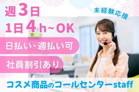 仕事内容 <<* おすすめポイント盛りだくさん *>> ◆週3日~空いた曜日でサクッと稼げる ◆1日4h~短時間・フルタイムどちらも歓迎 ◆18時以降&日祝は時給100円アップ★ ◆Wワークでプラスの収入が欲しい方OK ◆扶養内で働く主婦さんも活躍中 ◆ネイル・髪型・服装自由でオシャレ自由 ◆週払い制度で急な出費も安心◎ ◆Wi-Fi完備の広くてキレイな休憩室あり 【人気のコスメを社割価格で購入OK】 働きながらキレイになれちゃうかも?! 「コスメが好き」 「美容に興味がある」 「仕事中もオシャレしたい」 ・・・そんな方にもピッタリです! さらに、スキンケア研修もあり! 肌や化粧品の基礎知識が学べるので 「自分のケアにも役立つ!」 「知らなかったことが学べて楽しい!」 とスタッフからも好評なんです♪ 未経験でも始められるお仕事です♪ 幅広い世代に人気でリピーターも多い ”” あの人気商品 ””を扱っている 大手通販会社様のコールセンター窓口☆彡 コスメ・美容商品のテレビCMや広告を ご覧になったお客様からの注文受付や お問い合わせ対応などをお任せします♪ 【お仕事内容】 ◆新規ご注文の受付 ◆使用方法や商品のご説明 など 研修が充実しているので 「コールセンターは初めて」 という方も安心してください♪ 柔軟シフトで働きやすさ抜群♪ 勤務は週3日~◎ フルタイムはもちろん、 1日4h~の短時間シフトもOK! 「午前中メインで」 「お昼過ぎからゆっくり出勤」 「他バイトとかけもちで」 「学校帰りにそのままシフトイン」など あなたの希望の働き方が叶いますよ♪ 学生さんやフリーターさん、Wワーカー、 扶養内で家庭と両立する主婦さんなど 幅広い世代が在籍している職場です! 土日・祝日の空いた時間でサクッと お小遣いか正義する学生さんも在籍! 休憩の合間や始業前・終業後に 広々としたキレイな休憩室で レポート作成している方もいますよ!