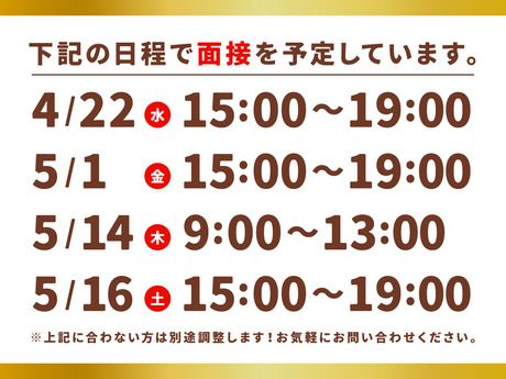 仕事内容 ★おすすめポイント★ ━━━━━━━━━━━━━━━━━━━━━━━━━━━━ 6/11(木)グランドオープン!同期20名と一緒にスタート♪ 全国1号店!新ブランドの「顔」として活躍できるチャンス。 ━━━━━━━━━━━━━━━━━━━━━━━━━━━━ ■週2日・1日3h~OK! 短時間からフルタイムまで自由自在。 ■オープニング大量募集! 20名の仲間と一緒だから心強い♪ ■駅から徒歩数分!! 通勤便利で、お仕事前後のお買い物にも最適。 ■社員割引あり!! 自慢のフィナンシェやクッキーがお得に買えます。 ★具体的なお仕事内容★ スコーン・ケイク・クッキー・チョコレート等の 洋菓子の店頭販売 ・品出し ・レジ打ち ・ラッピング※とても簡単です ・店内清掃 ・開店/閉店業務 「接客が初めて」「ブランクがある」という方も大丈夫! 充実した事前研修があります♪ まずは笑顔で「いらっしゃいませ」が言えればOK! あなたのペースに合わせて、丁寧にサポートしていきます。 ★柔軟な働き方を実現!シフト例も豊富★ 8:30~21:00の間で、ライフスタイルに合わせて調整可能! ・【主婦(夫)さん】 8:30~16:00 … 家事や夕飯の支度にも間に合う! ・【フリーターさん】 9:00~18:00 … フルタイムでしっかり安定収入。 ・【Wワークの方】 12:00~21:00 … 午後からゆっくり出勤。 ・【学生さん】 17:00~21:00 … 授業終わりの短時間で賢くバイト。 「今週はテストがあるから」 「子供の行事があって」など、 シフトの融通もバッチリ!面接時に遠慮なく相談してくださいね。 ★オープンまでの【研修】について★ 「いきなり店頭に立つのは緊張する…」という方もご安心ください! 6月のオープンまでしっかり研修を行います♪ 研修日程も、調整可能◎ 一流の接客マナーやラッピング技術を、 基礎から学べる絶好の機会です♪ オープン当日には、自信を持ってお客様を迎えられるよう私たちが全力でバックアップします! ★面接日程のご案内★ 下記の日程で面接を予定しています。 ・4/22(水) 15:00~19:00 ・5/1(金) 15:00~19:00 ・5/14(木) 9:00~13:00 ・5/16(土) 15:00~19:00 ※上記に合わない方は別途調整します!お気軽にお問い合わせください。 同期20名と一緒に、素敵なお店を作っていきましょう! ご応募お待ちしております♪