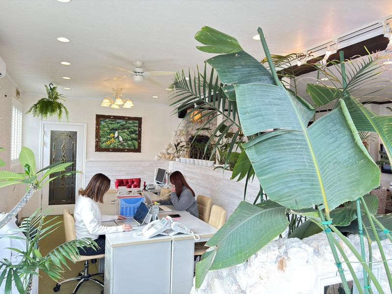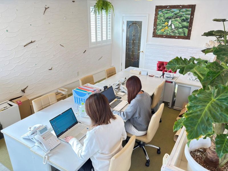 南国リゾート風のオフィス内にて事務スタッフ