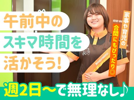 仕事内容 <経験に自信がなくても安心スタート♪> ◎未経験歓迎!久々のパート復帰も歓迎! フロント/受付/レジ/調理補助/ルーム清掃 ちょっとした洗い場など。 簡単な作業から1つずつお任せします。 当店では未経験スタートや、 ブランク復帰の先輩が多数活躍中! 「できるかな…」と不安な気持ちもよく分かります。 イチから丁寧に教えますし、 分からない事はスグ聞ける環境なのでご安心を! ★マニュアル動画を確認できる スタッフ専用タブレット端末もあります♪ <オープン~夕方の時間帯、募集中!> 「朝ダケ」「午前中」 「朝~夕方」 「昼~夕方」など ★短時間~長時間まで大歓迎! ★日数も週2日~週5日で好きな曜日でOK! ↓希望叶います♪ 「子どもの送り迎えや家事の合間に働きたい」 「子育ても落ち着いたし、フルタイムで稼ぎたい」 「早朝の空いた時間を活用したい」 「かけもち/Wワークでスキマ時間に勤務」 「今の生活にプラス収入UP」 <他の時間より比較的ゆったり落ち着いています◎> また、まねきは持ち込みOKなので、 フードの注文も他より少なめ! 清掃や、ポスター貼り等 モクモク作業の時間もあり◎ また、朝昼は常連さんも多く 時には差し入れやお土産を頂くことも♪ 慣れてきたら、仲良しのお客さんと 会話を楽しむ余裕もできますよ! <飽きずに、色んな人と働ける楽しさがあります♪> 芸人や歌手など夢追うフリーター、 子育て世代/子育て卒業世代の主婦パートさん、 大学生・短大生・専門学生、Wワーク社会人など 18歳以上・20代・30代・40代・50代の男女幅広く活躍中♪ 音楽やエンタメ好きにも嬉しい◎ 店舗数日本一のまねきねこでは、 アニメや漫画、アーティストやVtuber等との 珍しい期間限定コラボも頻繁に実施中! <他にも嬉しいメリット沢山★> ・自宅でいつでもできる! 履歴書不要のラクラクスマホ面接実施中! ・食事補助あり! ・50%OFF従業員割引あり! ・カタログギフトやミニボーナスが貰える! ・おしゃれもOK♪ お客さまが不快な思いをされないことが前提ですが、 明るい笑顔、清潔感のある方なら髪色や髪型は自由! ※お客さまに食事を提供する業務があるため、 ネイルは単色で装飾なし、 ピアスは片耳に1個ずつとさせていただきます。 ★時給UP!目指せまねきねこっ笑 しろねこ→くろねこ→まねきねこ、と ランクアップしていく昇給制度あり♪ ★社員登用あり