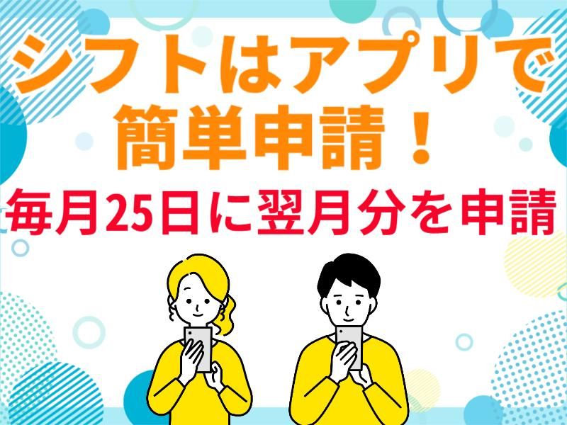 シフト制 勤務時間詳細 <勤務時間> 9:00~17:00の間で実働4h~の希望シフト制 (シフト例)9時~17時、10時~16時、10時~15時、11時~15時、13時~17時など ※シフトは毎月25日に翌月分の希望をアプリで送信! 送信後の変更も可能で、自分の予定や都合なども考慮した上で働ける♪