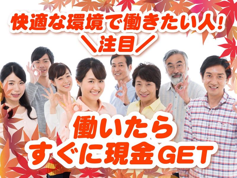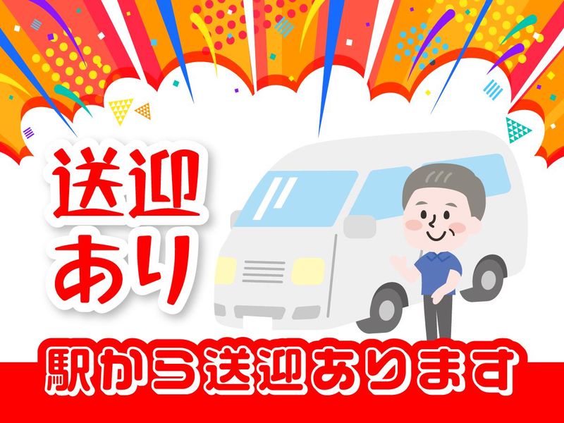【保険制度】 雇用保険、労災保険、健康保険、厚生年金 待遇・福利厚生 【福利厚生】 ■社会保険完備(法定通り) ■交通費規定支給 ■制服貸与 ■有給休暇 ■無料送迎あり \車・バイク・自転車通勤OK!/ ※車通勤は駐車場の空きによる ※駐車場・駐輪場完備 ※車・バイク通勤時ガソリン代規定支給 \作業エリア内、冷暖房完備!/ ■休憩室完備(冷蔵庫・電子レンジ・湯沸し器完備) ■個人ロッカー完備 ■お手洗い男女別完備 ■食堂完備(1食あたり500円程度) ■喫煙スペースあり ■近くにコンビニあり \給与振込方法が選べます!/ ■日払い振込み(仮払い) 当日働いた分を働いている間に振り込み。帰りにコンビニやATMで即おろせるので、毎日が給料日になっちゃいます! ※土日・祝日・連休を除く銀行営業日 ■月払い振込み(月末締め翌月25日) ※土日・祝日の場合は、前銀行営業日