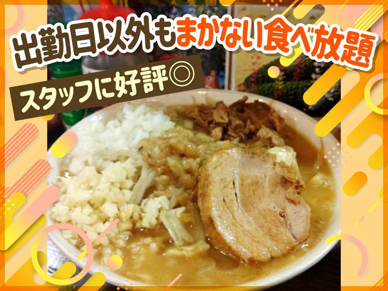 待遇・福利厚生 【福利厚生】 ■出勤日以外もまかない食べ放題 →本当に何でも食べ放題◎ ラーメン好きさんや ひとり暮らしさんなど スタッフみんなに大好評♪ ■昇給 ■髪色・髪型自由 ■Tシャツ・エプロン貸与(無料) ■車通勤ok(無料駐車場有) ■正社員登用有