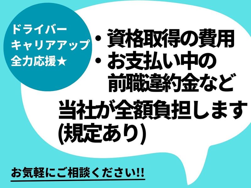 職場環境 ・毎年 2〜4台 新車 導入実績あり ・毎年 決算賞与 支給(過去実績5年以上連続) ・休みがとりやすい環境です(配車調整可) 喫煙所:喫煙所あり(屋外) 車内禁煙です