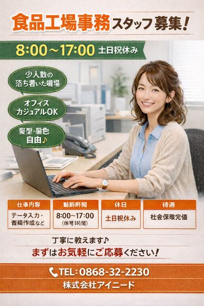 仕事内容 急集!! 創業58年の食品工場での労務・経理事務☆ 空調完備のオフィス 【主な仕事内容】 (労務関連) 勤怠管理(タイムカード集計、システム入力) 社会保険・雇用保険などの手続き 給与計算、年末調整補助 労働安全衛生に関する書類作成・管理 (経理関連) 請求書発行・支払い処理 入出金管理、小口現金管理 売掛・買掛金管理 月次・年次決算の補助 (一般事務) 電話・来客対応(取次ぎでOK) 書類整理、ファイリング ※オフィスには、5名程度の人員がいますのでフォローアップ体制があり安心 ゆっくり慣れていって下さいね☆ オフィスカジュアルでOK! 1名枠の募集です!気になる方は、お急ぎください! まずは、お問い合わせを♪ :+:・-・:+:・-・:+:・-・:+:・-・:+:・-・:+: ✨ おすすめPOINT 3つ ✨ *************************** ①基本平日のみ勤務で私生活充実◎ └土日祝休み&残業少なめ! ②将来安定を目指している方 └正社員登用実績あり! ③業務は丁寧に教えるので未経験でも安心! └教育体制がありますので、安心して働いて頂けます☆ :+:・-・:+:・-・:+:・-・:+:・-・:+:・-・:+:
