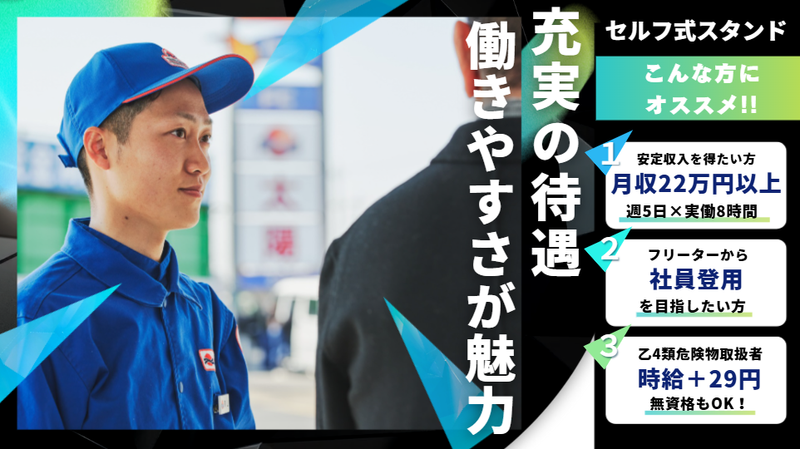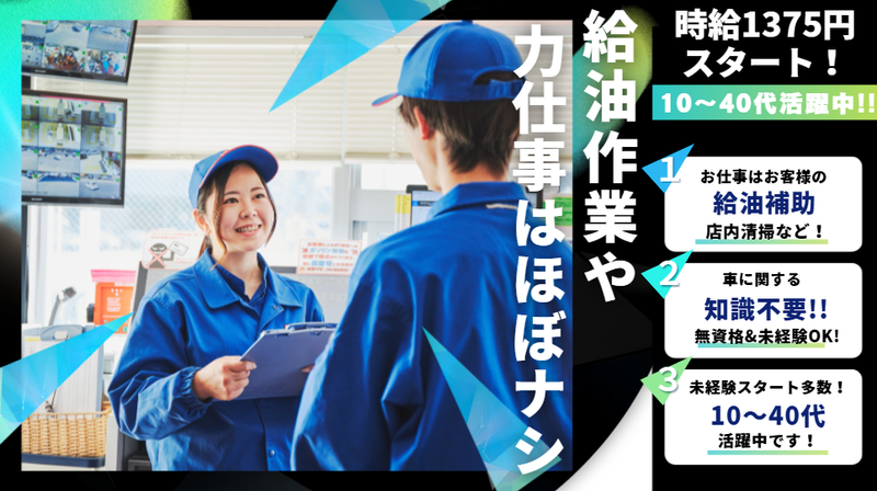 求めている人材 \未経験・無資格OK!学歴不問&ブランク歓迎/ ガソリンスタンドや車に関する 知識がなくても大丈夫! 実際に「やってみたい」で始めた 未経験の先輩も多数活躍中! 人柄・やる気を重視した採用なので、 まずはお気軽にご応募下さい♪ ✅【こんな方にオススメ】 ・フルタイムで安定収入を得たい方 ・シフトにたくさん入りたい方 ・接客よりコツコツ作業が好きな方 ・ルーティンワークが得意な方 ・フリーターから社員登用を目指したい方 ✅【活かせる経験・スキル】 ・セルフガソリンスタンドの勤務経験 ・車検・整備士工場などでの実務経験 ・メカニック、自動車整備士、自動車検査員などの資格・スキル ・カーディーラーでの接客や軽整備経験 ✅【優遇資格】 ◇乙種第4類危険物取扱者(時給+29円支給) ※資格がなくてもご応募OK!資格取得支援制度あり◎ ✅【活躍中のスタッフ】 10代~60代まで男女問わず幅広く活躍中! 主婦・主夫、ブランク明けの方も多数在籍しています。 フリーターさん歓迎!