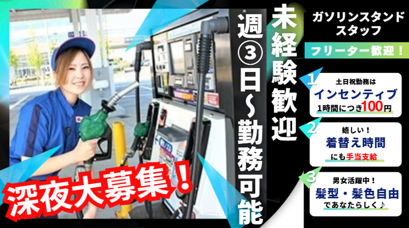 髪型・髪色自由のガソリンスタンドスタッフ(フルタイム・深夜)