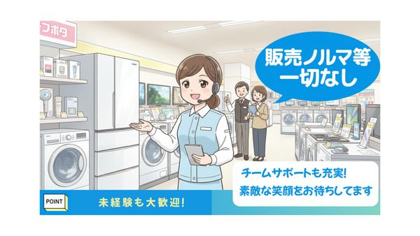仕事内容 【お仕事の内容・アピールポイント】 ▼ノルマなし!あなたのペースで働けます◎ 「こちらから無理に声をかけることはしなくても大丈夫です◎」 お客様から質問があったり、興味を持たれたお客様へアドバイザーとしてご案内するスタイルです。 押し売りは一切不要!プレッシャーなく、お客様に寄り添った接客ができます。 ▼未経験の方、知識ゼロでも全く問題ありません! 「最初は商品知識がなくてもOK!」 「家電に詳しくないけど大丈夫?」とご心配いりません。入社後にメーカーによる丁寧な研修があり、商品の魅力をしっかりと学ぶことができます。 困った時や分からないことは、周りの先輩や担当者がしっかりサポート!安心してスタートできますよ。 ▼主婦(夫)の方も活躍中!働きやすさが魅力 20代後半~40代の女性スタッフが中心となって活躍中。 人と話すことが好きな方、家電を通して豊かな生活を提案したい方にぴったりです。 大手メーカーの商品に関わるため、新しい知識やトレンドに触れることができ、日々新鮮な気持ちで働けます。
