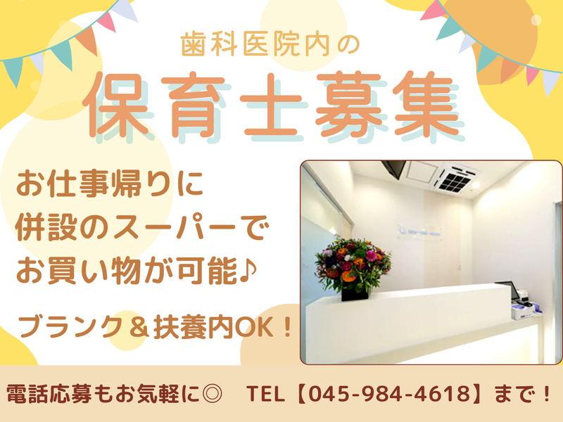 仕事内容 ⭐青葉台駅より徒歩3分の好立地! ⭐ブランク可!経験者は時給1500円~✨ ⭐歯科に関する知識も身につけられる♪ ▼電話応募もお気軽に✨▼ TEL【045-984-4618】まで! ・。★――――――――――――――― ✅お仕事内容 歯科医院内にあるキッズルームにて 保育士業務・歯科助手業務をお願いします♪ 《具体的には…》 ○託児や保育業務 ○環境整備 ○電話応対 ○診療補助(歯科助手) ○保護者様の相談対応等 ✨選べる勤務時間 フルタイムでガッツリ稼ぎたい方や、 自分や家族の予定に合わせて 午後のみ勤務している方もいます◎ ✨小児歯科に関する研修あり 働きながらスキルアップも目指せます! ✨親子で受診されるご家庭多数 ✨医療モール内に院を構えております! スーパーも併設してるので仕事終わり に買い物も可能です♪