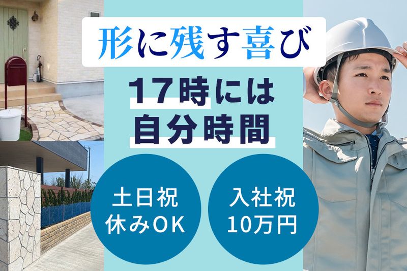 【アピールポイント】 \入社祝い金10万円!/ エクステリア会社の現場作業員を正社員募集! ■未経験OK・履歴書不要 ■土日祝休みOK ■残業なし
