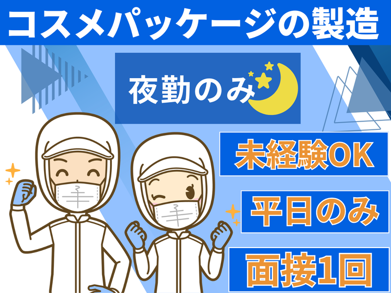 求めている人材 *未経験者歓迎 *資格不問 *学歴不問 *主夫・主婦、フリーター歓迎 成長できる環境で社会人デビューも歓迎! あなたの新しい未来とキャリアを応援します✨ \\ こんな方も歓迎✨ // ・夜勤で集中して高収入を得たい方 ・梱包作業や軽作業に興味がある方 ・安定したメーカーで長期的に働きたい方 ・家の近くで仕事を探している方 ・地元で勤務したい方も歓迎! ・モクモク・コツコツ作業が好きな方 ・土日祝休みの仕事をお探しの方 ・ハローワークでお仕事をお探しの方 \\ こんな経験活かせます✨ // ・アルバイト・パート、 正社員、派遣、などでの製造業 ・化粧品メーカー、化粧品製造、 工場での勤務経験 ・倉庫内のピッキングなど軽作業スタッフ ・夜間、夜勤での製造業