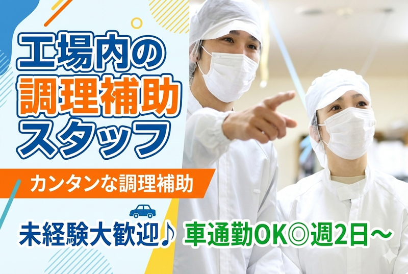 仕事内容 ――――――――――――――――・:* ✨ 未経験から始められる♪ ✨ ✨ 13時半までの勤務です◎ ✨ *:・―――――――――――――――― 家事の延長でできる 調理補助のお仕事です! 【 お仕事詳細 】 工場内の食堂でカンタンな 調理補助のお仕事です♪ 包丁はほとんど使わず 盛り付けや配膳準備が中心! 調理そのものはありません◎ ほとんどの方が 未経験からのスタート! 作業は毎日同じ流れなので 覚えることも少なめです♪ ――。・☆――――――――――☆・。―― ✅安心してスタートできます! - ほとんどのスタッフが未経験スタート! わからないことは先輩スタッフが イチから丁寧にサポートします♪ 「料理経験がなくて不安…」 という方もお気軽にご応募ください◎ ✅働きやすさもバッチリ! - ⭐13時半まで&週2日~OK! ⭐午後は自分の時間♪ ⭐家事・お子さんの送迎と両立可能◎ 「午後は自由に使いたい」 そんな方にピッタリです!