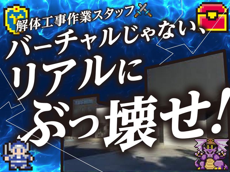 仕事内容 バーチャルじゃない、リアルにぶっ壊せ! 解体クエスト、ただいま仲間募集中! ==================== ■髪色・髪型自由 ■ヒゲ・ピアスOK ■資格不問・経験不問 ■土日祝休み (ご家庭などの都合考慮) ■賞与年2回・昇給あり ■日払いOK ■75日勤務後、祝金3万円支給 ■寮完備(即入居OK) ■資格取得支援あり ==================== 【解体クエスト開幕!】 仲間と一緒に街をリセット! 解体工事作業スタッフの正社員募集です。 コンクリートや内装材を重機や手作業で 解体するお仕事です。 (その他、土木などの作業あり) 関東一円の現場での作業です。 主に東京・茨城の各現場で働きます。 現場には先輩が一緒に行くので未経験でも安心です。 ==================== 【今日から解体レベル1】 資格取得支援あり!レベルアップも可能! 難しい作業はありません。 イチから丁寧に教えていきますので 「経験がない・・」 「ブランクがある」など そんな方も安心してくださいね。 ==================== 【ボーナスステージは日払い】 壊すたびに経験値UP! 普通免許をお持ちの方や経験者は優遇あり! また、日払いOKなので 急な出費があっても安心です。 ==================== 【ゲームオーバーなし】 解体ワークで安定収入! 月収26万円以上可能! 賞与や昇給制度もあり、 安定して長く働ける環境です◎ ==================== あなたの冒険は、ここから始まります。 一緒に街をつくり変えませんか? ご応募、心よりお待ちしています!