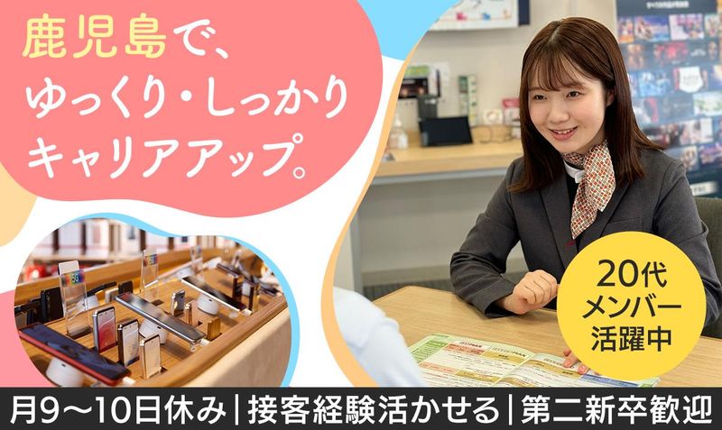 仕事内容 <<20代メンバー活躍中!>> 大切な家族やプライベートの時間と キャリアアップを両立可能! いままで培ってきたスキルを活かして、 鹿児島で活躍しませんか? 【求人のポイント】 ✅県外転勤なし!鹿児島で安定できる! ✅月9日休み(1、5、8、10月は10日) &残業は1日平均1時間未満 ✅明確なキャリアパスをご用意 ┗希望次第で管理職、幹部も目指せる ✅接客経験が活かせる ✅第二新卒さんも大歓迎 ✅賞与年2回&ドコモショップスタッフ特典あり! ..・・.・・.・・.・・..・・.・・.. 【仕事内容】 ドコモショップで、お客様の 「スマホのある暮らし」を サポートします。 研修で基礎から学べるので、 接客が初めてでも安心です。 <具体的には> ◆機種・料金プラン・サービスのご案内 ◆契約手続き、問い合わせ対応 (操作方法・修理・プラン変更など) ◆店内プロモーション、POP作成 ◆在庫・備品管理など <お客様からの相談例> 「故障したから修理をしたい」 「契約プランを変更したい」 「操作方法を教えてほしい」 など、シンプルな相談がメイン。 分からないことはスグに先輩に 聞ける環境ですので、ご安心ください! ━・━・━・━・━・━・━・━ 【接客の経験が活かせる】 業界問わず、接客の経験をお持ちの方、 人と接する仕事が好きな方なら、 今までのスキルを活かして 即戦力として活躍できます! 他にも受付や医療事務から転職した方も。 「こんな経験は活かせますか?」 といったご相談もお待ちしています♪ ・・・・・・・・・・ 【プライベート優先の働き方】 残業は1日1時間未満。 週休2日で、希望休の相談もできます。 リフレッシュ休暇なども充実しており、 プライベートの時間や、 家族・大切な人と過ごす時間と 両立しながら働くことが可能です。 ・・・・・・・・・・ 【頑張りがしっかり評価される環境】 頑張り次第でどんどん昇進、昇給可能。 年齢や学歴に関係なく、 誰もが成長を実感しながら活躍できる、 努力を評価する明確なキャリアパスを ご用意しています! *キャリアUP例* ★新入社員→一般職→指導職→ →管理職→経営幹部 ・・・・・・・・・・ <<スタッフに聞きました!>> 地元で安定できました! (Nさん/28歳/女性/入社2年目) - Q1. 当社を選んだ理由は? 地元を離れたくなかったので 県外への転勤がない事と、 プライベートとも両立できること、 大手で安定していることが 入社の決め手でした。 Q2. 前職の経験は活かせていますか? 以前はホテルのフロントで 受付の仕事をしていたのですが、 お客様へのお声がけやお気遣いなど、 活かせる場面は多いと感じました。 接客が好きだということも 評価して貰えたので、 モチベーションも上がりました! Q3.嬉しかったことは? プライベートが充実出来るように なったことです。 前職ではなかなかシフトが不安定で 繁忙期には残業もありましたが、 今の仕事は残業も少なく、 お休みも希望を出せるので 家族と過ごしたり、自分の趣味の時間を しっかり持てるようになりました!