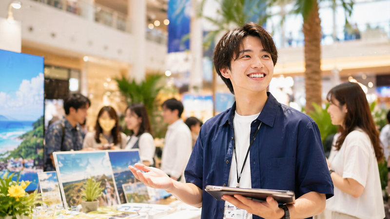 仕事内容: 【毎日同じ仕事の繰り返しで、この先の自分が見えなくなっている人へ】 観光業や接客業で働いているけれど、 毎日同じことの繰り返しで、正直少し飽きてきた。 人と関わる仕事は嫌いじゃない。 でも、このまま何年も同じ仕事を続けた先に、 自分に何が残るのかが見えない。 もっと将来に役立つ力を身につけたい。 もっと自分の可能性を広げたい。 ただ生活のために働くのではなく、 これから先につながる経験をしたい。 そんな方に向いているのが、この仕事です。 【仕事内容】 ショッピングモールやイベント会場で、 サービスや商品のご案内、提案、受付対応を行います。 ただ案内するだけではありません。 どうすればお客様に興味を持っていただけるのか。 どうすれば伝わるのか。 どうすれば行動につながるのか。 現場で経験を積みながら、 営業力、提案力、コミュニケーション力を身につけていきます。 【主な業務内容】 ・商業施設やイベント会場でのお客様対応 ・サービス、商品のご案内 ・ヒアリング、提案、受付対応 ・チームでのミーティング参加 ・現場運営のサポート ・将来的には新人育成やマネジメントにも挑戦可能
