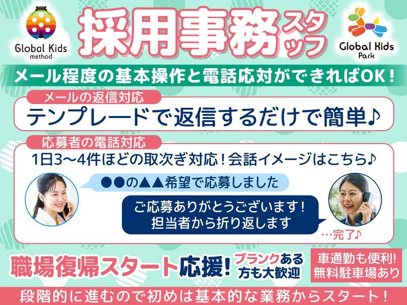 仕事内容 弊社求人への応募が来た際、 PCにてメールでのお問い合わせ対応や データ入力、1日3~4件程度の電話対応 を行うお仕事です。 マニュアルも完備しているので、 初めてでも安心ですよ◎ 集中してコツコツ進められる 事務ワークにチャレンジしませんか?♪ <主な仕事内容は…> 当社で掲載している求人への 下記業務をお願いします! ✅メールでの応募者へのご案内や返信 ✅簡単なデータ入力・確認作業 ✅電話応対(1日3~4件/取次程度) お問い合わせがきたら該当施設の 充足度合いを確認し、人材が必要なら 現場の担当者から折り返ししてもらう◎ 既に充足の場合はお断りのご対応でOK♪ ☘応募者さんからメールがきたら テンプレートでワンタッチ返信!☘ ☘お問い合わせのお電話が来たら こんな流れで対応できればOK!☘ あなた「ご応募ありがとうございます!」 応募者「●●の施設の職種は▲▲に応募しました!」 あなた「確認いたしまして担当者より折り返しご連絡いたします」 ⇒⇒⇒✨これで完了!✨ ◆慣れてきたら徐々に採用に関する業務も 手伝っていただきますが、 段階的に進めていくので最初は基本的な 対応ができれば大丈夫です◎ 「事務の仕事は久しぶり」という方も、 すぐに慣れて活躍してくれています! ブランク明け主婦さんや子育てママさん ものびのび活躍中ですよ◎