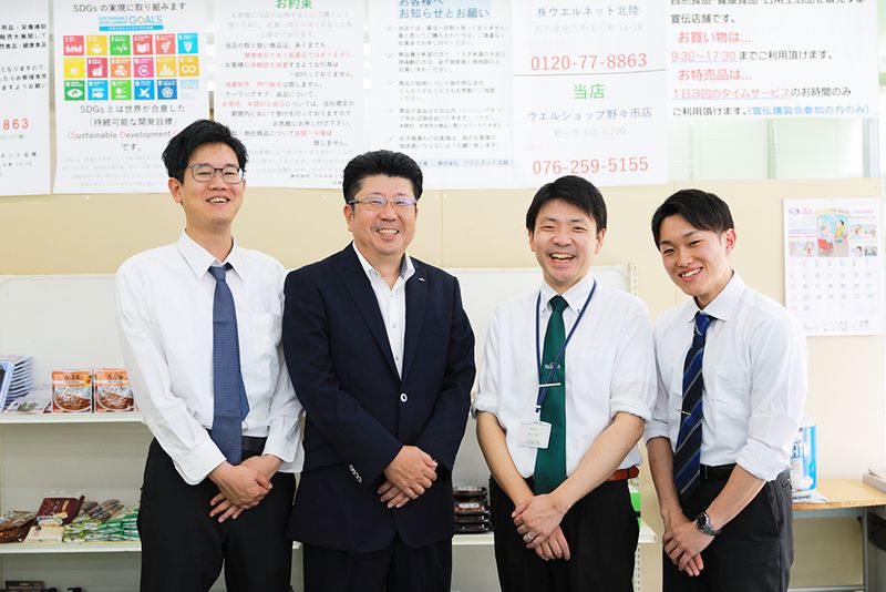 - 仕事概要・仕事に関するPR - ■ウエルネット北陸ってどんな会社? 来店してくれる方に健康食品やオーガニック食品などを説明・販売しています。もっとも身近で、頼りになるお客様のパートナーを目指して、商品に自信があると胸を張るだけでなく豊富な専門知識とカウンセリングによる「コミュニケーションを大切にした接客販売」を重視したサービスを提供しています。 経験不問!学歴不問!「今までと違った仕事に挑戦してみたい」「自分をより一層成長させたい」という方、おススメです。 社会経験が少なくても、異業種からでも始められるのが当社です。20代・30代から入社して、30代で店長、40代で管理職になった人もいます。これまでの職歴や経験に関係なく昇格できる環境なので、頑張りは即評価いたします。 売上ノルマはありませんので、お客様を第一にスタッフと協力しながら働いてください。 [入社後は…] ・最初はお客様の顔と名前を覚えることから始めます。先輩社員がサポートしますので、積極的にお客様とコミュニケーションを取ってみてください。 ・次に、商品知識を身につけていきます。1日3回の説明会があり、店長のサポート業務をしながら商品知識を覚えていきます。 ■安心の環境&賞与年3回や長期休暇など福利厚生も充実 一人ひとりが長く働ける環境を目指して、職場環境の整理や福利厚生の充実には前向きに取り組んでいます。 残業はほぼ無く、有給取得率は高めです。ワークライフバランスがとれますので1度働くと長く活躍してくれる方が多い会社です。 \スタッフインタビュー/ 【20代男性 入社3年目】 未経験でも安心して働ける環境を整えてくれている会社だと思います。 私は前職も接客業でしたが、自分から積極的に話すということはなかったので、最初は不安なこともありましたが 先輩社員が必ずフォローしてくれていたので安心でした。 その際もただ対応を変わるだけでなく、お客様との会話の中で話を軽く振ってくれたりと お客さんと話すきっかけを作ってくれたことを今でも覚えています。 【40代男性 入社19年目】 異業種からの挑戦でしたが、人に喜んでもらえる仕事がしたいと転職してもう19年。 今は店長を経て、管理職を任せてもらっています。 販売職だから売上は必要ですが、1番大切なことは利他の精神、感謝の気持ちだと思っています。 仕事・接客を通して人間的にも成長できました。 - 求人情報 - 「好きな街で長く働く」勤務地はご希望を考慮し配属します。 ・金沢本店(石川県金沢市玉川町14-18) ・鳴和店(石川県金沢市小金町8-16) ・野々市店(石川県野々市市位川280) ・内灘店(石川県河北郡内灘町字千鳥台4-1) ほか、富山県・福井県・滋賀県で店舗展開。今後さらに市場を拡大する予定です。 - 会社・仕事の魅力 - ウエルネット北陸の店舗はいつも笑顔があふれています。