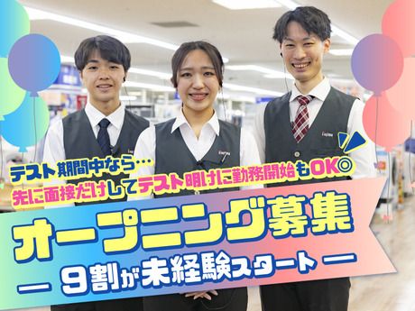 資格 ◆高卒以上 ※新学期応援!友達と応募も可! <90%以上の方が未経験スタート♪> 大学生 / 専門学校生 / フリーター / 主婦・主夫 / 中高年の方 etc. 家電に詳しくなくてもOK!! 皆さん大歓迎!! 【こんな方はぜひ】 ◇シフトが柔軟に組めるバイトがしたい ◇学校や家事、育児などと両立して働きたい ◇未経験でも安心して始められる仕事がいい ◇最新家電製品に詳しくなりたい etc. 「早く入社したい!」とお考えの方は、ぜひお気軽にご相談ください! できる限り柔軟に対応させていただきます。