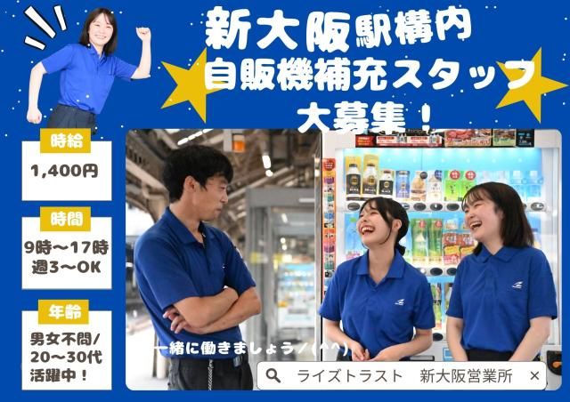 【新大阪駅構内】自販機補充スタッフ☆高時給1400円!駅ナカ/運転なし♪ラクラク通勤♪/フルタイム★ 株式会社ライズトラスト 駅構内の自販機補充スタッフ(運転なし)/週2日~ JR西日本グループ専属会社として、 JR駅構内の自動販売機の管理・オペレーション業務を担っています。 関西のJR沿線は、ほぼ当社が管理しています★ << 管理している自販機の数は数千台! >> NITTOホールディングスとして、現在成長し続ける会社の一つであり、 安定・安心の企業です。 今回募集するのは、よく駅構内で見かける台車を押しているスタッフさん… まさにそれです!売店に食品を納品したり、自販機に飲料を補充しています★ 半年以上の長期で安定して働きたい方大歓迎します◎ 経験は一切問いません。 仕事はイチから先輩が丁寧お教えします◎ 現在、20代~30代の幅広い世代が活躍中。 女性も活躍されています★ 勤務はシフト制。 希望は最大限考慮しますので相談ください。 日・祝日の勤務で高時給1400円です♪ 交通費支給は全額支給★待遇・福利厚生も充実。 将来は正社員も目指していただけます!