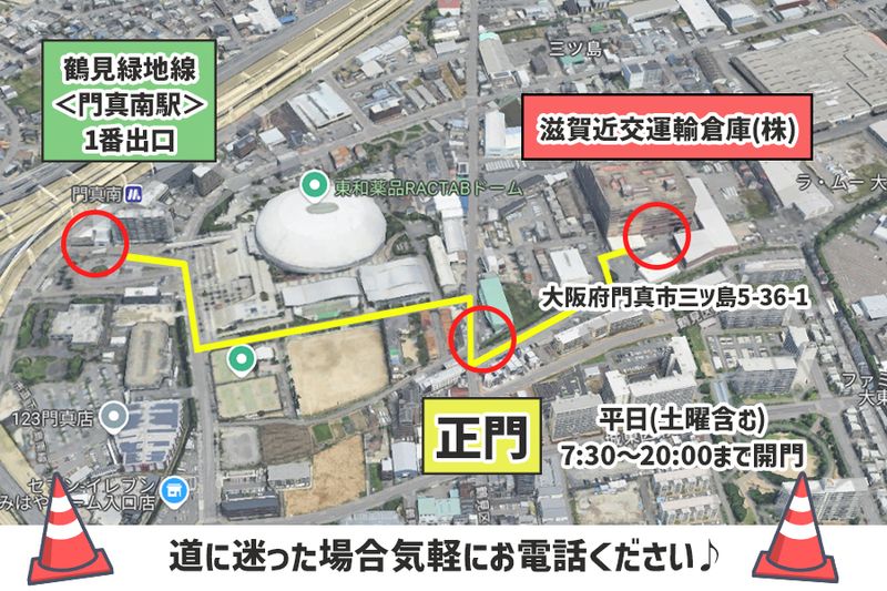 アクセス: Osaka Metro長堀鶴見緑地線「門真南駅」より徒歩8分 京阪本線「門真市駅」より自転車10分 JR学研都市線「鴻池新田駅」より自動車10分 ※自転車通勤OK(駐輪場完備) ※入口が少し分かりづらいためご注意ください。 (有料老人ホームの目の前が入口です。 トラックターミナル奥に建物がございます。)
