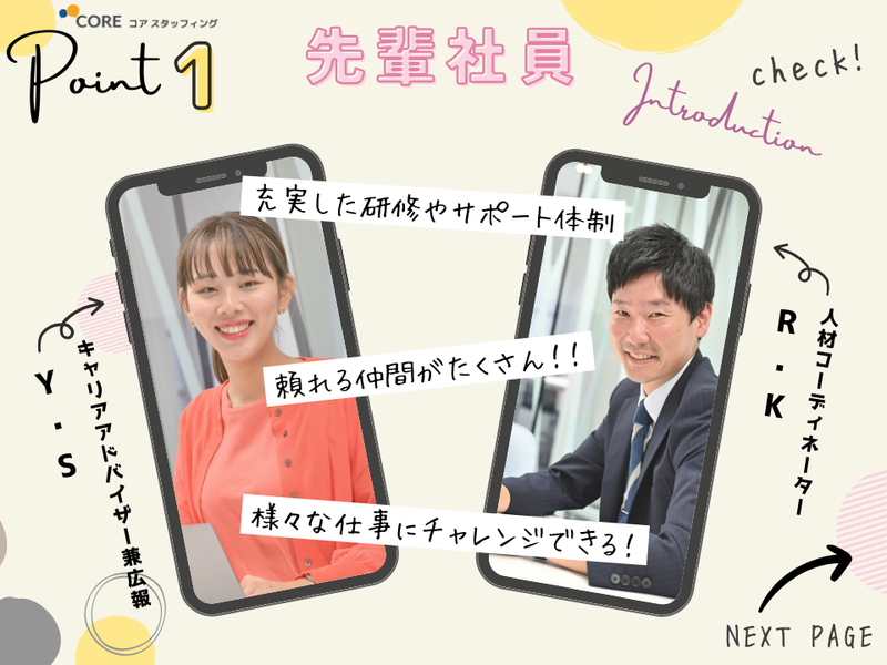 仕事内容 ━━━━━━━━◇◆◆◇━━━━━━━━ 【最初の一歩は、有名企業の顔になる】 ━━━━━━━━◇◆◆◇━━━━━━━━ 身近なブランドの商品をPRしながら、 接客や販売、企画など幅広く挑戦! ・店頭での販売・プロモーション ・サービス案内や受付、事務対応 ・販売促進・マーケティング企画 ・イベントの立案・運営もお任せ ━━━━━━━━◇◆◆◇━━━━━━━━ 【コアスタッフィングで描く未来】 ━━━━━━━━◇◆◆◇━━━━━━━━ ◎未経験スタート歓迎 ◎安定の長期キャリア ◎風通しの良い人間関係 ◎手厚い研修とサポート体制 ◎ステップアップも無理なく実現 ◎多彩なジョブローテーション制度 互いに助け合い、笑顔で働ける職場。 信頼を築きながら、成長できます! 年齢や経験に関係なく、 誰もが挑戦できる環境を整備。 キャリアの幅を広げたい方に最適! ━━━━━━━━◇◆◆◇━━━━━━━━ 【入社後のステップ】 ━━━━━━━━◇◆◆◇━━━━━━━━ ▼入社前研修で不安を解消 ▼店舗配属後は先輩がしっかりサポート ▼1~3年後のキャリア例 ・人材コーディネーター ・キャリアアドバイザー ・広報や人事などの本部職 ※現場続投の選択もOK! ━━━━━━━━◇◆◆◇━━━━━━━━ 【成果が昇給・昇格に直結】 ━━━━━━━━◇◆◆◇━━━━━━━━ ◆20代先輩のキャリア例 入社2年:リーダー昇格 入社3年:広報×キャリア支援を担当 あなたもここで、 理想の未来を築きませんか?