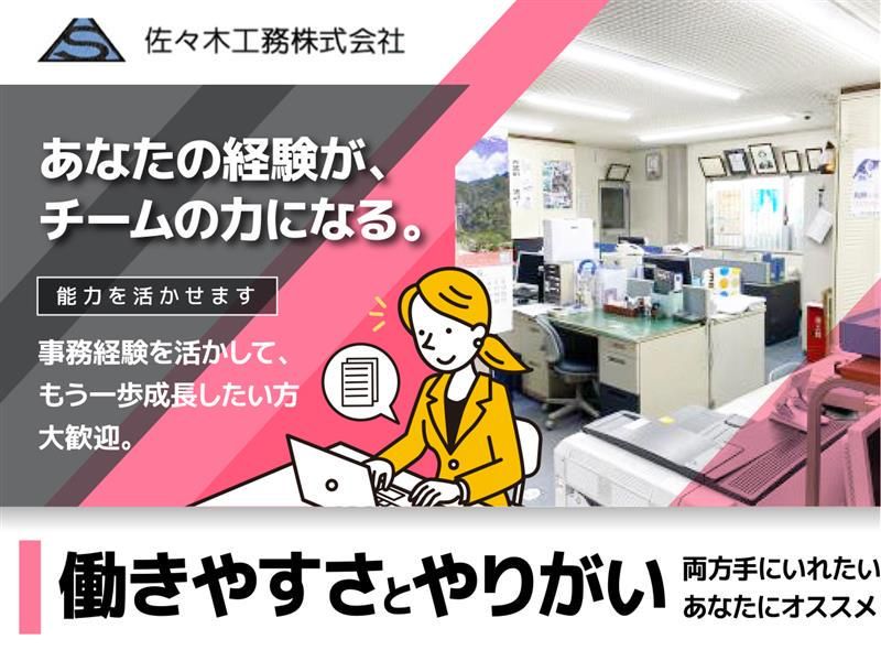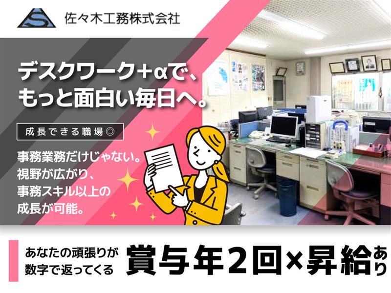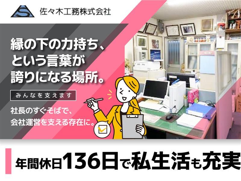 仕事内容 \魅力ポイント✨/ ✅年間休日136日(有給10日含む)/土日祝休み ✅賞与年3回・昇給あり/毎年給与アップ実績あり ✅会社から徒歩5分の所に社宅あり! ✅残業原則ゼロ(繁忙期に月10時間以内) ✅社内イベントや旅行あり(昨年は伊豆箱根)/新年会・忘年会・BBQ ―――社長と会社全体を、 事務の力で支える。――― 創業83年の「佐々木工務株式会社」で 【社長秘書・一般事務】を募集します。 当社は、大手百貨店や商業施設など 人が集まる空間づくりを手がけてきた安定企業。 今回お任せするのは、 社長の業務サポートを中心とした一般事務・秘書業務。 難しい専門知識は不要ですが、 「気配り」「段取り」「正確さ」が活きるポジションです。 【仕事内容】 社内業務が円滑に進むよう データ入力や電話応対などの 一般事務業務をお任せします。 ◎主な業務内容 ・データ入力(Excel・Word) ・データ集計 ・電話対応 ・資料作成 ・メール対応 ・スケジュール管理 ・来客の対応 ・その他付随する業務 社長や社内メンバーをサポートする立場なので、 「指示待ち」より先回りして動ける方が活躍しやすい環境です。 「ただの事務」で終わらず、 信頼される右腕ポジションを目指せます! 【この仕事の魅力✨】 ✅ 社長のすぐそばで、会社運営を支える立場 経営に近い距離で働けるため、 視野が広がり、事務スキル以上の成長が可能。 ✅ 正当に評価される安心感 スキル・経験に応じた月給設定で、 「何を頑張れば評価されるか」が明確。 ✅ ワークライフバランスも◎ ・年間休日136日(土日祝休み) ・残業ほぼなし(月10h以内) ・社宅あり(会社から徒歩5分) ・賞与年3回+昇給年1回 長く勤めるほど待遇が上がる、安定した環境です。 【こんな方に向いています】 ・事務経験を活かして、もう一歩成長したい方 ・社長や周囲を支えるポジションにやりがいを感じる方 ・細かい気配りや段取りが得意な方 ・安定企業で腰を据えて働きたい方 「誰かを支える仕事が、実は一番得意」 そんなあなたに、ちょうどいいポジションです。