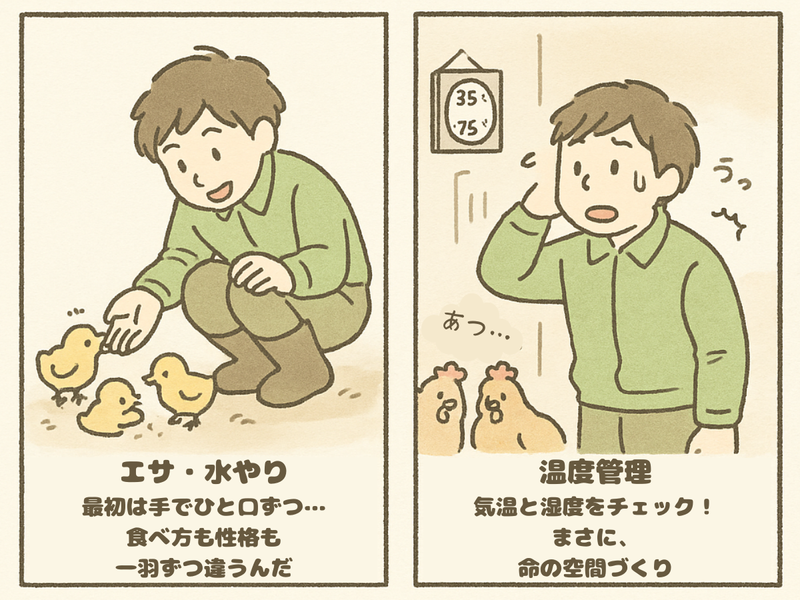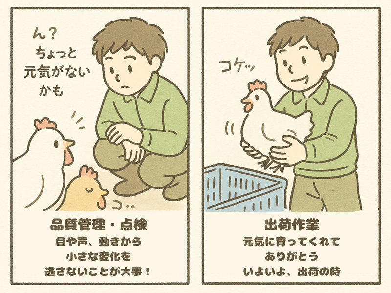 仕事内容 「何かを始めたい」 ――そう思ったあなたへ。 今の自分をちょっと変えてみたい。 都会の暮らしに疲れた。 動物と関わる仕事がしてみたい。 理由はなんだっていいんです。 ここには、命と向き合う仕事があります。 最初はわからないことだらけ。 にわとりの繊細さに驚くかもしれません。 でも毎日を重ねるうちに、 あなたの中に“育てる力”が育っていきます。 小さな一歩が、大きなやりがいにつながる そんな仕事、はじめてみませんか? =================== ✅仕事内容 エサ・水やり ▶最初は手で与え、 成長に合わせて自動に切り替えます。 でも、自動になっても チェックは欠かせません。 性格も食べ方も一羽ずつ違うんです。 鶏舎の温度管理 ▶気温や湿度に応じて毎日調整。 まさに“命の空間づくり”です。 設備点検・清掃 ▶電球や給餌機の不具合チェック、 ひよこを迎える前には徹底清掃。 水洗い・消毒・乾燥でピカピカにします。 品質管理 ▶「ちょっと元気がないな」 と感じたらすぐにケア。 目や動き、鳴き声から 小さな変化に気づくことが大切です。 出荷作業 ▶育てた鶏が無事に大きくなったら、 いよいよ出荷。 一羽一羽を大切に運び出し、 送り出す大事な瞬間です。 など =================== 飼育は会社の中では とっても重要な役割なんです。 私たちは、鶏を育てて出荷し、 商品としてお客様に届けるところまでが仕事。 にわとりが健康に育たなければ、 何も始まらないんです。 それだけに、責任は重大。 でも、それ以上にやりがいのある仕事なんですよ。 にわとりって、実は とっても繊細な生き物なんです。 大きな音に驚くだけでも、 命を落としてしまうことがあります。 性格もさまざまで、 のんびり屋さんもいれば、 ちょっとビビりな子もいます。 だからこそ、毎日しっかりと観察し、 一羽一羽を丁寧に育てる必要があります。 1棟まかされるようになると、 何千羽もの命を預かることに。 でも、それがやりがいになるんです。 親心がくすぐられる仕事。 大変だからこそ、面白い。 「生き物を育てるって、こういうことなんだな」 と実感できます。 - ✅現場のリアル(でも、そこが好き) 正直、楽な仕事ではありません。 夏は暑く、冬は寒い。 においもあるし、ほこりも舞う。 だから、仕事帰りにデート …はちょっと厳しい(笑) 一度お風呂に入ってからでないと無理ですね。 命と向き合うことでしか味わえない、 達成感と感動があります。 たくさんの小さな命が、 あなたの手を通して育ち、旅立っていく。 それは、誰にでもできる仕事ではありません。
