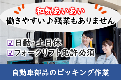 仕事内容 最新技術の倉庫内!リーチフォークリフトを使用しての自動車部品ピッキング作業!あの有名自動車企業の直請けの倉庫なので安定! <仕事内容> 有名自動車会社の部品を扱っている倉庫でのお仕事になります。 フォークリフトを利用しての自動車バンパーやホイールなどをピッキング、梱包のお仕事です♪ 社内も和気あいあいとしており、働きやすい環境です♪ 立ち作業でのお仕事です。 《環境》 ロッカー有り|休憩室完備 アピールポイント <仕事内容> 有名自動車会社の部品を扱っている倉庫でのお仕事になります。 フォークリフトを利用しての自動車バンパーやホイールなどをピッキング、梱包のお仕事です♪ 社内も和気あいあいとしており、働きやすい環境です♪ 立ち作業でのお仕事です。 《環境》 ロッカー有り|休憩室完備 \充実した福利厚生/ ◎社会保険・雇用保険完備 ◎有給休暇有・残業手当 ◎交通費支給(規定内) ◎確定拠出年金制度 ◎週払い制度(週3回対応) ◎お友達推薦制度あり(規定有り)※1名につき3万円~10万円臨時給与として支給 ◎車(マイカー)・バイク通勤可(無料駐車場あり) ◎ロッカー・休憩室利用可 ◎仕出し弁当あり ◎制服貸与 ◎福利厚生プログラム (宿泊、グルメ、ショッピングなど大幅割引が受けられる10万アイテムのメニューがあります。)