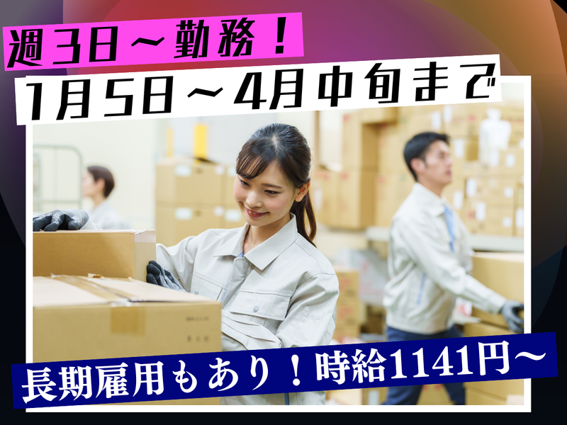 仕事内容 ┏━━━━━━━━━━━━━━┓ ✨ 1月5日~4月中旬までの短期募集! ✨ 未経験でもできるシンプル軽作業♪ ✨ 時給1300円~で効率よく稼げる! ┗━━━━━━━━━━━━━━┛ 「短期間でしっかり稼ぎたい!」 「コツコツ作業が好き」 そんな方にピッタリの 倉庫内ピッキング・梱包のお仕事です。 【お仕事内容】  ̄ ̄V ̄ ̄ ̄ ̄ ̄ ̄ ̄ ̄ ̄ ̄ ̄ ̄ ̄ ̄ ̄ ̄ ̄ 倉庫内にて ✔ 本・CDなどのピッキング ✔ 仕分け・検品 ✔ 梱包 ✔ 軽作業に付随する作業管理 など 扱う商品は軽量物が中心なので、 初めての方でもスグに慣れて活躍できます♪ ■このお仕事のポイント  ̄ ̄V ̄ ̄ ̄ ̄ ̄ ̄ ̄ ̄ ̄ ̄ ̄ ̄ ̄ ̄ ̄ ̄ ̄ ・手順が決まっているため未経験の方も安心 ・黙々進めるシンプル作業 ・景気に左右されにくく、安定した業務量 ・短期集中で収入アップ! ■無理なく働ける安心環境  ̄ ̄V ̄ ̄ ̄ ̄ ̄ ̄ ̄ ̄ ̄ ̄ ̄ ̄ ̄ ̄ 週3日~勤務OKで、 私生活との両立もしやすい環境です。 慣れるまでは先輩が近くでサポートするので、 初めての方でもすぐに馴染めます◎ 落ち着いた雰囲気の倉庫で、 短期でも安心して働けます。 ■未経験スタートの方も多数活躍中!  ̄ ̄V ̄ ̄ ̄ ̄ ̄ ̄ ̄ ̄ ̄ ̄ ̄ ̄ ̄ ̄ 前職が事務など、 物流が初めての方も大歓迎。 扱うのは本・CDなどの 軽量商品なので負担少なめ♪ 簡単なピッキング・梱包中心で、 短期間でもしっかり スキルを身につけられます。 ■こんな方にピッタリ!  ̄ ̄V ̄ ̄ ̄ ̄ ̄ ̄ ̄ ̄ ̄ ̄ ̄ ̄ ̄ ̄ ◎コツコツ作業が好き ◎短期でしっかり稼ぎたい ◎未経験から挑戦したい ◎景気に左右されにくい業界で働きたい