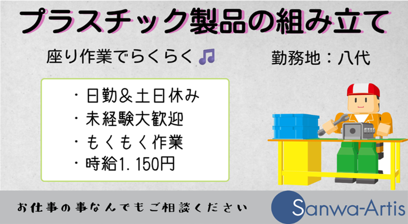 仕事内容 座って1人もくもく作業✨ 未経験者さん、大大大歓迎(`・ω・´) ー 気になるお仕事の内容は? ー かんたん作業から始めて慣れてきたら 次のステップへスキルアップもできます✨ 【具体的には?】 〇図面を確認 〇手順通りに組み立て 〇見本と同じようにできているかチェック✅ 〇決まった場所に置く などをお任せします♪ コツコツ・モクモク作業が好きな方 大歓迎です◎ 平均20代~30代男女スタッフ活躍中♪ 製造業未経験でも そもそも工場未経験だよって方でも 先輩スタッフが優しく丁寧に教えますので 安心して作業ができます! 「どんな職場かなぁ(゜゜*)」 「どんな製品を扱っているんだろう?」など 気になることがありましたら まずは私たちと一緒に見学に行きませんか? ー お仕事のおすすめポイント ー ■うれしい座り作業(*´з`) ■室内・冷暖房完備の快適空間 ■日勤帯◎ ■土日休み+長期休暇あり ■残業でしっかり稼げる ■全くの未経験者でも積極採用中♪ ■フレッシュな世代が活躍中◎ ■女性も男性も活躍できる環境 ■1人1つの机作業 ■クリーンスーツは着ません *作業着(貸与)での作業です ■社会保険完備 ■オンライン面談随時受付中◎ *お家にいながら面談できる ■職場見学できます! *お気軽にお問い合わせください◎ (就業場所の変更の範囲) 会社の定める就業場所 (従事すべき業務の変更の範囲) 会社の定める業務