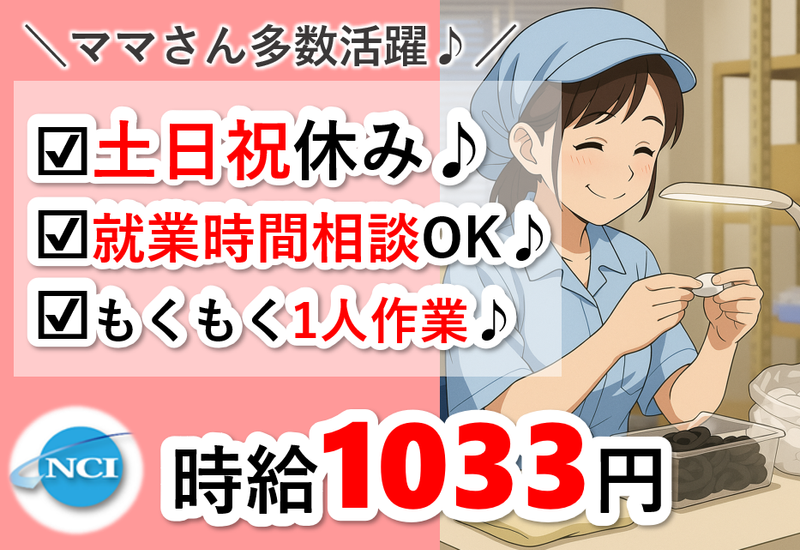 仕事内容 ◇お仕事内容◇ 【測定検査作業員(座り作業)】 ゴム製品を製造している工場にて、医療用ゴム製品の検査作業をお任せします。 未経験の方でも始めやすい、座って行うモクモク作業です。 ◇主な業務内容◇ ・成形された医療用ゴム製品の目視検査 ・拡大鏡を使用して、キズやヨゴレがないかを確認 ※基本的に座り作業です ※ライン作業ではありません ―――――――――――――― ◇未経験でも安心◇ ・資格、経験は一切不要! ・検査手順は丁寧に教えてもらえます♪ ・同じ作業の繰り返しなので、慣れればスムーズに作業できます♪ ・目の前の作業に集中できるコツコツ作業です♪ ―――――――――――――― ◇働きやすいポイント◇ ・完全日勤のみ ・土日祝休み ・大型連休あり(年間休日120日以上) ・就業時間の相談OK ・子育て世代に理解のある職場 現場では20代〜50代の主婦の方が多数活躍中です。 ―――――――――――――― ◇職場環境◇ ・新白河駅から車で20分 ・作業服貸与 ・清潔で落ち着いた作業環境 ―――――――――――――― ◇ここがポイント◇ ・未経験から始められる検査作業 ・座り作業で体への負担少なめ ・日勤のみ、土日祝休み ・家庭やプライベートと両立しやすい ―――――――――――――― ◇こんな方におすすめ◇ ・未経験から工場勤務にチャレンジしたい方 ・座ってできる仕事を探している方 ・モクモク作業が好きな方 ・検査や軽作業の経験を活かしたい方 ・年間休日がしっかりある職場を希望する方 ―――――――――――――― ◇サポート体制◇ 就業後も当社営業スタッフがしっかりフォローします。 派遣が初めての方や、久しぶりのお仕事復帰の方も安心して働けます。 ―――――――――――――― ◇応募について◇ まずは仕事内容の確認だけでもOKです。 お気軽にお問い合わせください。 ―――――――――――――― ■■■ここもチェック!■■■ ◇未経験スタート多数 ◇経験者活躍中 ◇有資格者活躍中 ◇フリーター活躍中 ◇即日勤務OK ◇ブランクOK ◇週4日以上OK ◇長期 ◇家庭都合休OK ◇学歴不問 ◇40代スタッフ活躍中 ◇50代スタッフ活躍中 ■■■■■■■■■■■■■■ ===お仕事開始までの流れ=== 1、まずはお気軽に下記応募フォームから ご応募ください! 2、採用担当より追ってご連絡を いたしますので面談日時を調整します! 3、スタッフ登録を兼ねた 面談と職場見学を行います! 4、入社が決まったら弊社事務所にて 入社手続きを行います! 5、お仕事スタート!! ご不明点等ございましたら お気軽にお問合せくださいませ。 〒961-0908 福島県白河市大手町12番地1 駅前田部井ビル2F 株式会社 NCI 白河支店 電話番号:0120-744-555 (通話料金はかかりません) (※お電話にてご応募の際は 「求人サイトを見て」とお伝えください!) 一般労働者派遣事業許可番号:派07-300732 職業紹介事業許可番号:07-ユ-300310