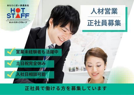 仕事内容 【正社員】未経験から月収50万円以上が可能!土日祝休み&賞与ありの人材コーディネーター この仕事の「稼げる」リアル。 「営業未経験で月収50万なんて怪しい…」と思うかもしれません。 正直にお伝えすると、最初は覚えることもありますし、 岩手県内(一関~盛岡)をアクティブに走り回る仕事です。 ●未経験でも安心 代表の金澤自身も未経験スタート! 最初はスタッフさんの名前を覚えるところから始め、2年目には月収50万円を達成しました。 ●正当な評価 「担当スタッフさんが○名増えたら月収が○万円アップ」 という明確な基準があるから、モチベーションが途切れません。 中には2年目で月収70万円を超えるメンバーも! ●「ありがとう」の対価 企業様と求職者をつなぐ。 感謝される数が増えるほど、あなたのお給料も上がっていく、 非常にシンプルでやりがいのある仕組みです。 *・。'.・。'.・。'.・。'.・。'.・。* *【具体的な仕事内容】* 担当エリア(一関~盛岡)の企業様と、お仕事を探しているスタッフさんの「架け橋」になるお仕事です。 ●企業様へのアプローチ 「人手が足りなくて…」と困っている企業様を見つけ、解決策を提案します。 ●スタッフさんのマッチング 応募があった方とお会いし、ご希望にピッタリのお仕事を紹介。 ●フォローアップ 就業後も「就業されてみて困っていることはありませんか?」 と寄り添い、継続的にサポートします。 ★ 未経験でも大丈夫な理由 3ヶ月間の手厚い研修と、先輩のOJT同行があります。 「電話でなんて話せばいいかわからない…」 そんな時は、隣にいる先輩がサッと代わって手本を見せてくれる。 そんな温かい文化がある職場です。 ※社用車・社用携帯貸与あり(業務にて使用) ★1日の流れスケジュール(例) 08:00…出勤 08:30…初勤務の派遣スタッフさんの付き添い (「頑張りましょう!」と背中を押す瞬間です) 10:00…担当企業様への訪問・打ち合わせ 12:00…昼休憩 13:00…スタッフさんの職場見学に同行 15:30…移動の合間に事務処理や電話連絡 18:00…退勤 ・**・・・**・**・・・**・ 【ホットスタッフ岩手】で働くメリット5選! 1. 完全週休2日制(土日祝休み) 年間休日125日。高収入を目指しながら、家族や趣味の時間もしっかり守れます。 2. 圧倒的なキャリアスピード 拠点拡大中のため、ポストは多数。社歴に関係なく「やってみたい」という意欲を重視します。 3. 社員12名の「顔が見える」安心感 代表を含め12名のチーム。目標達成した時は全員でハイタッチするような、活気ある雰囲気です。 4. 車・スマホ・PC、すべて会社が用意 社用車や携帯、PCは無償貸与。営業活動に必要なツールはすべて揃っています。 5. 履歴書よりも「これから」を重視 「今の生活を本気で変えたい」「将来のために貯金したい」…そんなあなたの“本音”を面接で聞かせてください。 ・**・・・**・**・・・**・ ≪安心のフォロー体制≫ 研修期間は3カ月間! 派遣に関する業界知識・法令などを一から丁寧にお教えます。 その後のOJT研修では、実務を通じて仕事の流れを学んでいきます。 先輩と同行しながら顧客・スタッフさんへの対応を身につけていってくださいね。 困ったことがあれば先輩がサポートしてくれる環境なので安心してください! 営業経験不問*販売や飲食からのスタートも大歓迎! *「新しく営業の仕事にチャレンジしたい」 *「とにかく稼ぎたい」 *「今の環境を変えたい!」など \ 志望動機は何でもOK! / 一緒に会社を大きくしていきましょう! ・**・・・**・**・・・**・ 【代表からメッセージ】 はじめまして。ホットスタッフ岩手 代表の金澤です。 2023年に開設したばかりの新しい営業所を、一緒に盛り上げてくれる仲間を探しています。 僕も最初は営業未経験でした。失敗して落ち込んだこともありますが、それを乗り越えて「稼げる楽しさ」を知りました。 今のスタッフも、コツコツ派から熱血派まで様々ですが、みんな「誰かの役に立ちたい」という気持ちは共通しています。 「自分にできるかな?」と不安な方も、まずは一度お話ししませんか? あなたの新しい一歩を、僕たちが全力で支えます! ・**・・・**・**・・・**・ PR・職場情報 【ホットスタッフ岩手の魅力】 ■完全週休2日制!土日祝休みでプライベート充実!! ■2年目で月収50万円以上可能!! ■サポート力を身に付けたい方におすすめ! ■社員は全員で12名程です! ■支社長や管理職へのキャリアアップも可能! ■学歴・経験は不問!研修制度があるので安心!! ☆おススメポイント☆ ・勤務期間:長期 ・未経験者歓迎 ・高収入 ・車通勤OK ・土日祝休み ・駅近く ・室内分煙 ・通勤手当支給※規定あり ・退職金制度あり 求人ID:260494760025 拠点コード:株式会社ホットスタッフ岩手