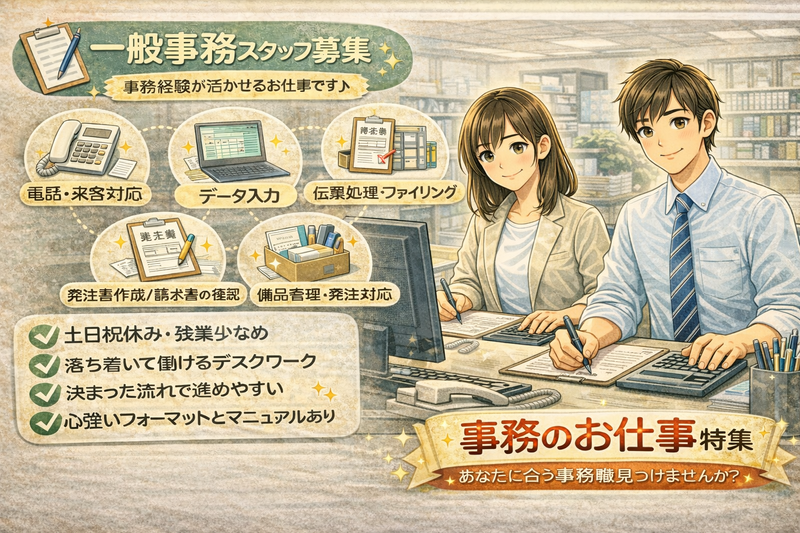 仕事内容 【お仕事について】 ラミネート工場の事務所で、 工場運営を支える事務サポート業務をお任せします。 難しい判断や専門知識はなく、 これまでの事務経験を活かしながら 落ち着いて働ける環境です。 現場作業はありませんので、 事務に集中したい方に向いています。 【主な業務内容】 行っていただくのは、一般的な事務作業が中心です。 ① 電話・来客対応 ・取引先や業者からの問い合わせ対応 ・社内担当者への取り次ぎ ・来客時の簡単な対応 マニュアルや社内ルールがあるため、 一人で判断する場面は多くありません。 ② データ入力 ・受注情報の入力 ・在庫管理データの入力 既存のシステムやフォーマットを使用します。 正確にコツコツ進める作業が中心です。 ③ 発注書の作成・処理 ・決められたフォーマットでの発注書作成 ・内容チェック、送付作業 複雑な書類作成はありません。 ④ 伝票・請求書の管理 ・納品書・請求書の確認 ・データ管理、ファイリング 数字を扱う業務もありますが、 流れが決まっているため安心です。 ⑤ 備品の発注・管理 ・事務所や工場で使う消耗品の管理 ・必要に応じた発注対応 「気づいたら補充する」 そんなサポート役のポジションです。 【この仕事が合う方】 ・事務経験を活かして働きたい方 ・工場現場ではなく事務所で働きたい方 ・コツコツとした作業が得意な方 ・人を支える仕事にやりがいを感じる方 ・落ち着いた環境で長く働きたい方 【安心して働ける理由】 ・業務内容が明確で分かりやすい ・既存フォーマット・マニュアルあり ・一人で抱え込む仕事はありません ・工場運営を裏から支えるポジション これまでの事務経験を 無理なく活かせる環境です。 【応募について】 いきなり応募するのは不安… という方も大丈夫です。 ・仕事内容を詳しく聞いてみたい ・職場の雰囲気を知りたい ・自分の経験が活かせるか相談したい そんなお問い合わせも歓迎しています。 応募=即決ではありません。 まずはお気軽にご連絡ください。 【担当者より】 このポジションは、 工場がスムーズに動くために欠かせない存在です。 事務経験を活かして、 現場を支える仕事に興味がある方、 ぜひご応募ください。 -ここがポイント- ■事務経験を活かせる! ■長期でのお仕事! ■幅広い業務でスキルアップ! ■しっかりと稼げる! ===お仕事ポイント=== 【おすすめポイント】 事務経験を活かせる! ・これまでの 一般事務、営業事務、経理補助 などの経験が活かせます! ・「ルーティンワークだけでは物足りない」「業務の幅を広げたい」方に最適! 安定した環境で長期勤務◎ ・派遣先は 大手メーカーと取引のある安定企業 ! ・長期的にキャリアを積める職場環境です 幅広い業務でスキルアップ! ・一般事務だけでなく、発注管理や請求書対応 など、業務の幅を広げたい方におすすめ! ・主体的に業務を進められる環境で、経験をさらに活かせます! しっかり稼げる! ・残業があるため、安定した収入を確保できる! ・業務に柔軟に対応できる方にはおすすめ! 「これまでの事務経験を活かして、しっかり働きたい!」という方、大歓迎! ご応募お待ちしております! ◇担当営業が就業を全力サポート!◇ NCIの強みの強みはなんといっても手厚い労務管理! 担当営業が就業場所に顔出しをして 困ったことや悩み事があれば なんでも相談に乗りますよ! 20代・30代・40代・50代と幅広い年代の方が活躍中です! 就業前の職場見学も随時受付中! まずはお気軽にご応募ください! 気になったことはお気軽にご相談ください! この求人以外にもみなさんにぴったりなお仕事をご紹介します♪ ===新型コロナウイルスの対策について=== 面接時マスク着用 出勤前の検温 従業員マスク着用 アルコール消毒液設置 飛散防止パネル設置 2時間おきの換気・除菌 など安心してご来社いただけるよう コロナ対策を行っております◎ リモート面接OK! 出張面接も対応しております! 気軽にお問い合わせくださいね! ===お仕事開始までの流れ=== 1、まずはお気軽に下記応募フォームからご応募ください! 2、採用担当より追ってご連絡をいたしますので面談日時を調整します! 3、スタッフ登録を兼ねた面談と職場見学を行います! 4、入社が決まったら弊社事務所にて入社手続きを行います! 5、お仕事スタート!! ご不明点等ございましたらお気軽にお問合せくださいませ。 - この求人以外に派遣・バイト・アルバイト・パートや軽作業、製造、事務のお仕事に興味のある方、短時間、短期・長期歓迎です。 郡山市、須賀川市、本宮市、田村市、小野町、二本松市、泉崎村でお仕事をお探しの方、未経験、ハローワークでお探しの方もお問い合わせください。 - 〒961-0908 福島県白河市大手町12番地1 駅前田部井ビル2F 株式会社 NCI 白河支店 電話番号:0120-744-555 (通話料金はかかりません) (※お電話にてご応募の際は 「求人サイトを見て」とお伝えください!) 一般労働者派遣事業許可番号:派07-300732 職業紹介事業許可番号:07-ユ-3