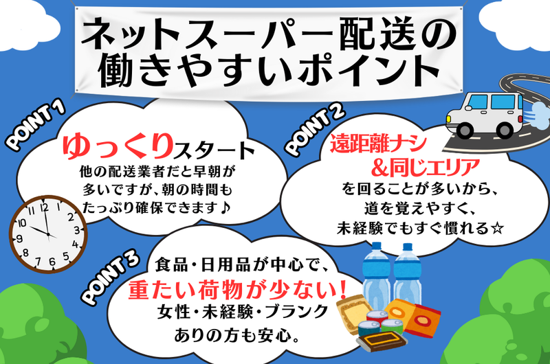 仕事内容: ▼△▼△▼△▼△▼△▼△▼△▼△▼△▼△▼ 「思ってたよりラク」 そんな声が多いのが、 ネットスーパー配送です!⭐ 【楽チンな理由!✨】 その1:配送ドライバー業の中でも かなりゆっくりスタート✨ 9:00~積込/10:00~配達 その2:積込が基本的に1回のみなので、 効率よく作業ができます! その3:固定の狭いエリアでなので コースを覚えやすく運転も楽チンです! _______[1日流れ]________ 9:00|出勤・積込み 拠点に集合。 すでに準備されている商品を 車に積み込みます。 10:00|配送スタート 近場エリアへ配送 19:00~20:00頃|配送終了 配達が終わり次第終了。 _____________________ こんな楽なのに、未経験でも 日当16,000円~ で、かなりの高単価です✨ さらに、積み込み・配達が丁寧で、 安定して任せられる方は、特別支給で 日当18,000円にUP⭐ ▲▽▲▽▲▽▲▽▲▽▲▽▲▽▲▽▲▽▲▽▲