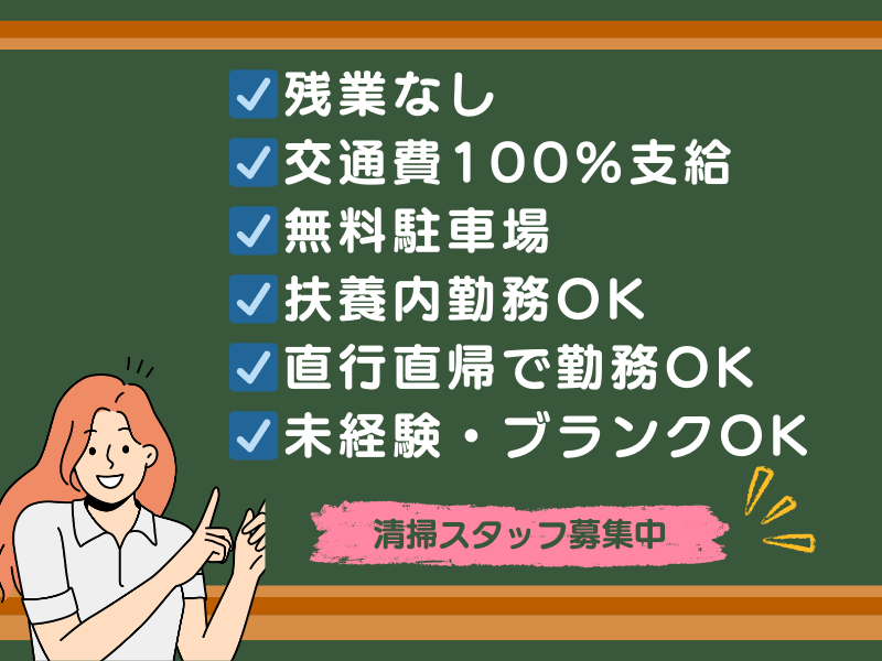 職場環境 清掃の仕事は一人でもくもく個人ワークですが、「困った」「わからない」にはお互い助け合える職場です 喫煙所:なし(敷地内全て禁煙)