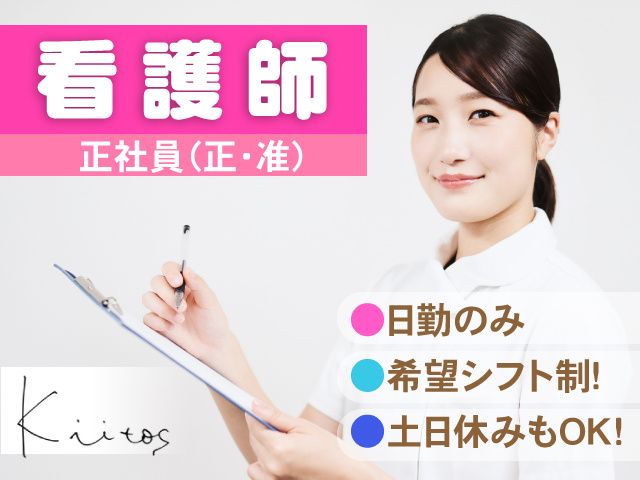 仕事内容 <看護師/正社員〉 未経験・新卒・第二新卒の方のチャレンジもOK!! 日勤のみの看護師スタッフ求人募集です! <当施設のポイント> ◎日勤のみの勤務 ◎希望シフト制 ◎土日休みOK! ◎資格や経験が活かせる仕事! ◎昇給・賞与あり ◎20代~50代のスタッフ活躍中! ◎長期で安定した職場です! ◎充実した福利厚生あり! 〈募集職種〉 正社員/正看護師・准看護師 〈必須資格〉 正看護師・准看護師 〈勤務地〉 特別養護老人ホームキートス南八幡・キートス山名 (高崎市山名町836-1) <仕事内容> 特別養護老人ホームでの介護業務看護業務 ・入居者様の健康管理、バイタル測定 ・服薬管理、服薬指導 ・栄養・食事摂取のケア ・往診対応、病院・医師との連携業務 ・健康相談 ・医療用物品管理、発注 ※介護業務のフォローに入っていただくこともあります。 利用定員79名+10名のショートステイ、原則要介護3以上の方が生活しております。 ゆったりとした時間が流れる介護施設で、入所者様1人ひとりを大切にした介護を提供しています。 〈未経験スタートOK〉 正看護師・准看護師資格をお持ちでしたら、 実務未経験・来春新卒や第二新卒の方もでもOK! 協調性のある方、患者さんに優しく対応できる方歓迎します。 子育てがひと段落してお仕事に復帰したい方など、ブランクのある方も歓迎。 当施設では20代~40代までのスタッフが活躍されています。 若年層から中高年の方まで幅広い世代のご応募お待ちしています。 介護施設・病院・クリニックでの看護師経験のある方、 正・准看護師の資格をお持ちの方、看護師としての経験の浅い方、 看護師としてブランクのある方のご応募もお待ちしています。 <お休みしっかり> 日勤のみ、シフト希望休なのでしっかりお休み出来ます! お子様の学校行事やご家庭のご都合などの急なお休みの融通も利きます! <充実の福利厚生> 社会保険、昇給・賞与あり、退職金制度、各種手当、制服貸与、仕出し弁当あり。 様々な待遇・福利厚生で働くスタッフのみなさんをバックアップしています。 <幅広い年代が活躍中> 当施設では、20代・30代はもちろん、40代・50代それ以上の中高年、 ミドル・シニア世代の主婦(夫)さん・子育てママさんまで、幅広い年齢のスタッフが活躍しています。