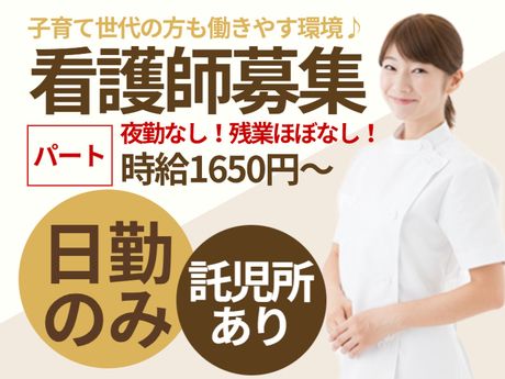 仕事内容 運営法人について ━━━━━━━ 医療法人毅峰会 ━━━━━━━ 「小さくても、大病院にない温かく心のこもった、どこにも負けない医療を提供できる病院を、我々で創ろう」と創立いたしました。 【事業内容】内科・消化器内科・循環器内科・呼吸器内科・皮膚科・放射線科・血液内科・整形外科・泌尿器科 就業先施設について 全78床病棟 ■内科、整形外科等を行っている病院 ■入院患者は、平均55名(2病棟) <通勤方法・その他補足> ※車通勤可(駐車場あり:自己負担3000円/月) ※送迎バスあり(行きAM8:00/帰りPM5:45) <受動喫煙対策> あり(屋内禁煙) ■受動喫煙対策に関する特記事項 全館禁煙 <新型コロナウイルス感染防止対策実施> マスク着用での勤務、アルコール消毒液完備などの感染対策をし、利用者様もスタッフも守れるよう体制を整えています。 病院/病棟での看護業務全般 <主な業務> ・健康チェック ・服薬管理 ・医療処置や機器管理 ・療養上の看護 ・医療、介護の相談 ・ターミナルケア ・リハビリ など ここがポイント♪ ━━━━━━━━━━━ パートさん募集 ━━━━━━━━━━━ ■病棟で働く看護師(看護職員/看護スタッフ)さん募集♪ ■看護師/准看護師の資格をお持ちの方を募集しています。 ■経験が浅い方からベテランさんまで幅広く募集しています ■入職後は、紹介先施設の直接雇用(パート)としての勤務となります ━━━━━━━━━━━ うれしい高時給! ━━━━━━━━━━━ ■看護師:時給1650円 ■准看護師:時給1650円 ■月収24万円以上可能 ■その他、待遇・手当充実! ■利用可能託児施設あり ━━━━━━━━━━━ 夜勤はありません♪ ━━━━━━━━━━━ ■日中のみ勤務 ■週4日勤務より相談OK ■残業はほとんどありません ■土日祝が出勤できる方、大歓迎 求職者様の手数料・費用負担ゼロ!応募から就業開始まで、あなたの転職をサポートします♪ ━━━━━━━━━━ 有料職業紹介について ━━━━━━━━━━ 有料職業紹介とは、人材を必要とする企業様から求人依頼を受け、紹介会社がその企業に見合った求職者様をご紹介するサービスです。 「有料」と聞くと、「応募したらお金がかかる」と思っていませんか?それは間違いです! 求職者様には紹介手数料や費用など、料金は一切発生しませんので、どうぞ安心してご応募ください。 ━━━━━━━━━━━━━━ 他にもいろんなお仕事をご用意♪ ━━━━━━━━━━━━━━ ■未経験OKのお仕事 ■平日のみ・土日祝休みや長期休暇ありのお仕事 ■高収入・高時給のお仕事 ■日勤のみのお仕事 ■短時間・時短のお仕事 ■夜間・深夜・夜勤専従のお仕事 ■残業なし・学歴不問・正社員登用・急募のお仕事 ■主婦・主夫が活躍できるお仕事 ■子育てと両立できるお仕事 ■60歳以上のシニアさん歓迎のお仕事 など