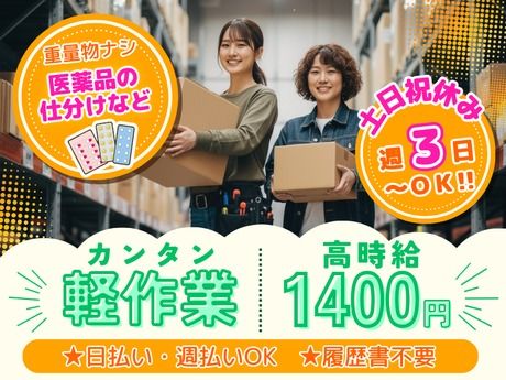 【急募】履歴書不要!平日週3日~OK!日払い・週払いOK♪髪・ピアス自由!重いものナシで未経験安心◎