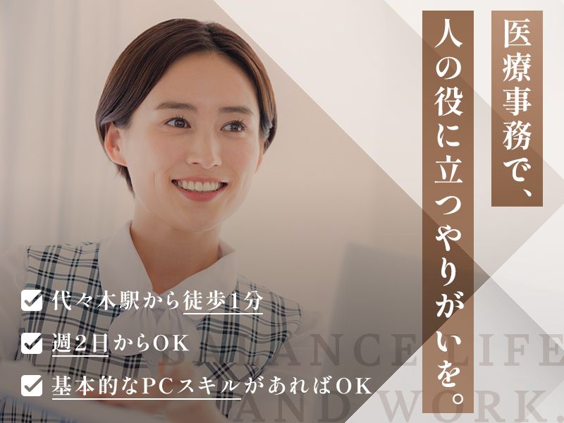 仕事内容 / PCスキルを活かして、 医療事務デビューしませんか? \ 【POINT】 ✨代々木駅から徒歩1分の好立地! ✨週1日からOK! 時間・曜日も相談可能 ✨基本的なPCスキルがあれば応募OK 【仕事内容】 受付、会計、電話応対、電子カルテ入力、 患者様対応、院内清掃など、 クリニックの運営に関わる業務全般をお任せします。 【当クリニックについて】 脳神経内科、内科、循環器内科、 消化器内科など幅広い診療科目を扱い、 患者様の健康をトータルにサポートしています。 【チーム体制】 看護師: 1名 保健師: 1名 公認心理師: 1名 精神保健福祉士: 1名 検査技師: アルバイト2名 + 委託2社 医療事務: アルバイトのみ