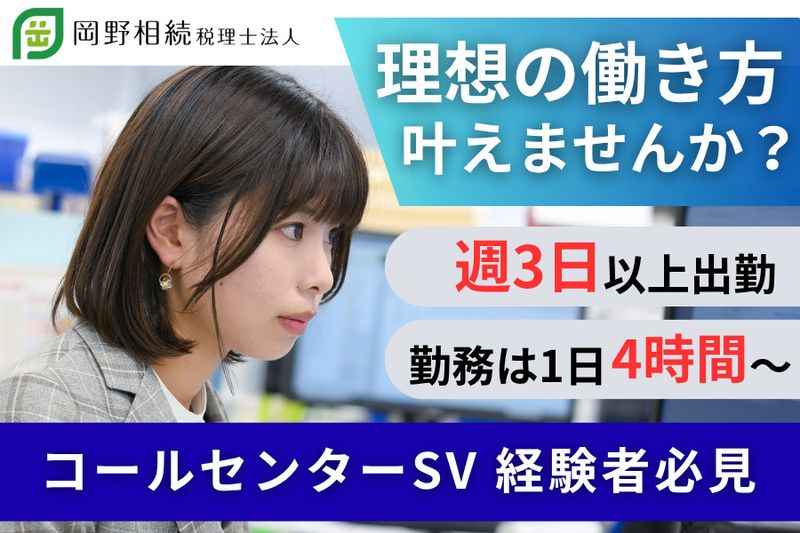 【仕事内容】 税理士法人のコールセンターでアポインターを取りまとめるスーパーバイザー・SVのポジションを担うパートスタッフを募集しています。 今後のさらなる事業拡大を見据えての増員募集です。経験者限定求人となりますので、ライフワークバランスを見直したい方は必見! ■PRポイント ・週3日~、1日4時間以上の勤務 ・有給取得率、産休育休復帰率100% ・月平均残業時間は3時間未満 ■こんな方にオススメ ・ライフワークバランスを見直したい ・マネジメントや人材教育の分野で貢献したい ・家庭や育児と両立しながら働きたい 【具体的な仕事内容】 相続税の申告・還付を専門に扱う当事務所にて、コールセンターのSVをお任せします。 ・アポインターの管理 ・アポインターの教育 ・アポの管理 ・アポインターのフォロー ・顧客情報管理(問い合わせ内容の管理) =================== あなたの経験、パートで活かしませんか? =================== これまでのSVやリーダーとしてのご経験を、週3日からの働き方で活かしてみませんか? 「家庭の事情でフルタイムは難しい」 「マネジメント経験を無駄にしたくない」 「限られた時間の中でも誰かの支えになりたい」 そんな想いを持つ方にぴったりのポジションです。 当法人では、少人数体制のコールセンターを支えるSVとして、アポインターの育成やフォローを担当していただきます。 現場で働くスタッフが安心して業務に向き合えるよう、丁寧な声かけや細やかな気配りが大きな力になります。 ==================== あなたに合った「ちょうどいい」働き方を ==================== 週3日〜・1日4時間から勤務OK。シフトも柔軟に調整可能なので、お子さまの学校行事や家庭の都合に合わせた働き方が叶います。 「午前中だけ」「週に数日だけ」など、ライフスタイルに合わせて無理なく働ける環境だからこそ、長く続けられると好評です。 また、有給休暇の取得率は100%。体調不良や急な用事などにも柔軟に対応しており、無理なく安心して働ける体制が整っています。 「仕事も生活も、どちらも大切にしたい」そんなあなたの気持ちを尊重できる職場で、新しい一歩を踏み出しませんか? ================ 岡野相続税理士法人とは… ================ 相続は一生に何度も経験することではありません。だからこそどうしたらいいか困っている方が多くいらっしゃいます。 相続を円満に終えたお客様やご家族みなさまから感謝される瞬間は、何物にも替えがたい喜びです。 お客様や弊社で働く人たちとの信頼関係を第一とし、居心地の良い働きやすい事務所を目指しています。 【求人ID-TEL03】