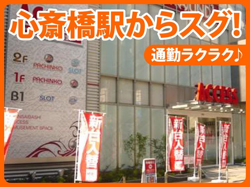仕事内容 具体的なお仕事内容は ・お客様の対応 ・景品カウンターでの景品交換 ・問い合わせ対応 など 社員が常に常駐しているため、 何かあった時でも安心して勤務できます! また、小型無線機インカムで、 みんなと連絡をとりあえます! わからないことがあってもすぐに 仲間が駆けつけるから安心して勤務できます! 【安心して始められます!】 パチンコやスロットに関する 知識や経験は一切不要! 今までパチンコやスロットで 一度も遊んだことない方も 全く問題なく働けます! 「パチンコやスロットへ興味は特になく、 心斎橋駅から近くでバイトしたかった」 という動機で始めた子が大半! お客様対応に必要なパチンコ台の 基本的な知識や、 景品交換時の換算方法などは 研修でしっかりお教えします。 もちろん、パチンコやスロットを 普段からたしなむという方も歓迎です。 サービスに活かせることがきっとありますよ!