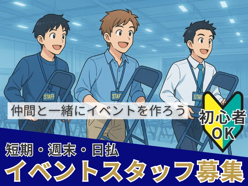 求めている人材 ▼未経験歓迎!大学生OK! ▼体を動かすのが好きな方 ▼チームワーク重視の方 ▼元気な挨拶ができる方 <歓迎条件> ・高卒、専門卒、大卒の方 ・新卒、第二新卒の方 ・業界/職種の未経験歓迎 ・副業、フリーターの方 ・仕事にブランクがある方 ・扶養内で働きたい方 <活かせるご経験> 送迎ドライバー、配送ドライバー、 uber、出前館、didi foods等の配達員を やってみようかな...とお考えの方も歓迎! レストラン、居酒屋、スーパー、ホテル、コンビ二などでの接客・販売、 鳶職、現場仕事、軽作業、解体工事、建築作業員、 土木作業員、物流、倉庫内軽作業、食品製造、調理士など 他職種・他業種とのWワークをお考えの方もお待ちしております!! ★過去に行われた・現在進行しているイベント例★ ■プロサッカーチームの試合会場設営撤去(通年) ■モデル関連の大規模イベント(通年) ■プロ野球関連の大規模イベント(通年) ■大学等の文化祭イベント ■大型商業施設の改装 ■オフィス間の移転作業 ■大型ライブ会場設営撤去 等々