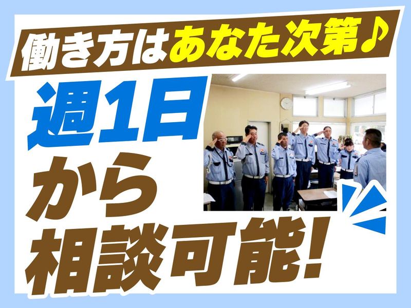 仕事内容 ================= スキマ時間を有効活用で収入ゲット☆ 週1日からでも勤務OKなので、 Wワークや副業にもぴったり! 万全のフォロー体制で 未経験でも安心スタート♪ ================== ▽仕事内容 ―――――――――――――――――― 道路や建築現場、イベント会場で ・交通誘導 ・歩行者誘導 ・駐車場警備、駐車場管理 など警備のお仕事をお任せします。 ※みんなで乗り合わせて 現場まで向かうことが多いです。 (事務所は法界院駅より徒歩3分) 場所によっては 現場まで直行直帰も可能! ▽未経験も安心スタート ―――――――――――――――――― まずは10日間の会社研修から。 先輩と2人1組で現場に入り 業務の流れをつかんで頂きます。 マンツーマンの手厚い研修、 丁寧なフォローでしっかり学べます。 質問もすぐにできる環境で、 未経験スタートも安心!