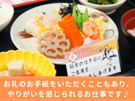 職場環境 【従業員構成】 お食事を召し上がっていただくのは 老人ホームのご利用者様。 健康と味の安定のために 調理はすべて計量! 衛生面にも気を配っています◎ 大変なこともありますが、 お礼のお手紙をいただくこともあり、 やりがいを感じられるお仕事です♪ 【職場の雰囲気】 立ち仕事 アットホーム 力仕事が少ない