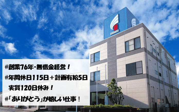 仕事内容 =================== 創業76年の信頼を力に100年企業を目指す。 人の暮らしと社員の幸せを追求しています。 【勤務地】静岡県沼津市小諏訪911 片浜駅より車で7分 =================== ✼* \\この求人のポイント//✼* ✩.。…………………………………………。.✩ ✨ 創業76年・無借金経営! └ 地域トップクラスの安定企業♪ ✨ 年間休日115日+計画有給5日で実質120日休み! └ プライベートも大切にできる★ ✨「ありがとう」が嬉しい仕事! └ 暮らしづくりを支える仕事をしませんか? ✩.。…………………………………………。.✩ ⭐仕事内容  ̄ ̄V ̄ ̄ ̄ ̄ ̄ ̄ ̄ ̄ ̄ ̄ ̄ ̄ ̄ ̄ ̄ ̄ ̄ お取引のある地域のビルダー、建設会社を 中心に、建物づくりに欠かせない、 木材、建材やキッチン、バスといった設備の 提案・販売・納品を行います。 ⏩主な業務内容  ̄ ̄ ̄ ̄ ̄ ̄ ̄ ̄ ̄ ̄ ̄ ̄ ̄ ̄ ̄ ̄ ̄ ̄ ̄ ̄ ✅ 建材・設備などの提案営業 ✅ 見積もり・発注・納期管理 ✅ 施工手配・職人調整・現場進行の確認 ⏩とある営業の1日のスケジュール  ̄ ̄ ̄ ̄ ̄ ̄ ̄ ̄ ̄ ̄ ̄ ̄ ̄ ̄ ̄ ̄ ̄ ̄ ̄ ̄ 8:30 出社・朝礼、メールチェック 9:00 お客様先へ出発 (1日3~5件ほど訪問) 12:00 昼食 13:00 午後の訪問スタート 16:00 帰社、見積書作成や発注業務 17:30 退社(お疲れ様でした!) お客様との会話を楽しみながら、 じっくり関係を築いていけるのが魅力です! ⭐入社後のキャリアステップについて  ̄ ̄V ̄ ̄ ̄ ̄ ̄ ̄ ̄ ̄ ̄ ̄ ̄ ̄ ̄ ̄ ̄ ̄ ̄ 当社では、一人ひとりが着実に成長し、 長期的なキャリアを築けるよう、 全力でサポートをしています。 将来的には既存顧客と信頼を深めながら、 地域の新たな建設会社や工務店とのネットワーク拡大にも 取り組みます。 ▼STEP 1: まずは先輩同行で、 商品知識やお客様との接し方を じっくり学んでいきます。 大切なのは、まずお客様に 顔と名前を覚えていただくこと。 焦らず、あなたのペースで成長しましょう。 ▼STEP 2: 少しずつ担当のお客様を引き継ぎ、 一人で訪問する機会を増やしていきます。 お客様との信頼関係を深めていく、 仕事が一番面白くなる時期です。 ▼STEP 3: 後輩の指導を任されたり、 より規模の大きな案件に挑戦したりと、 中心的な存在として活躍を期待しています。 将来的には、本人の希望と適性に応じて、 リーダーや管理職といったポジションを 目指していく事も、もちろん可能です。 ⭐スタッフインタビュー  ̄ ̄V ̄ ̄ ̄ ̄ ̄ ̄ ̄ ̄ ̄ ̄ ̄ ̄ ̄ ̄ ̄ ̄ ̄ Q:営業職のやりがいは? 「一つひとつの仕事に真剣に向き合うことで、 自分の知識や経験が広がり、お客様からの 信頼も大きくなっていきます。 成長を楽しみながら、新しいことにも 積極的に取り組んでいます。」 ⭐数字で見るイシハラの”働きやすさ”  ̄ ̄V ̄ ̄ ̄ ̄ ̄ ̄ ̄ ̄ ̄ ̄ ̄ ̄ ̄ ̄ ̄ ̄ ̄ ̄ ✅ 従業員数:173名(グループ全体) ✅ 平均年齢:42.5歳 ✅ 男女比:男性 85% / 女性 15% \営業サポート職と連携しながら、仕事を進めます/ ✅ 有給取得率:58.7% ╭━━━━━━━━━━━━━╮ 「ありがとう」その一言が、 私たちの原動力です。 ╰━v━━━━━━━━━━━╯ この仕事の面白さは、お客様との信頼関係を じっくりと築き上げていけること。 「次も、あなたにお願いしたい」 その言葉をいただくために、 私たちは日々お客様と向き合っています。 あなたの誠実な姿勢が、 お客様の満足と、街の景色を創っていく。 そんな大きなやりがいを、 あなたもここで感じてみませんか? =================== 会社について =================== 私たちイシハラ株式会社は、愛知・静岡に根ざして70年以上。 1949年の創業より、住宅資材の販売から事業を拡大して、 地域の"暮らし"や"街づくり"を支えてきた会社です。 取り扱っているものは、建物を建てるために欠かせない建築資材。 単にモノを売るだけではなく、工事の手配や建築現場管理、資材の 加工工場まで自社で一貫して担えることが強みです。 お客様は、地域の工務店、ハウスメーカー、建設会社など。 今では1,000社以上のお客様とつながり、日々たくさんの建物づくりを 支えています。 私たちの仕事は、ただ建物を建てるだけではありません。 そこに住む家族の暮らしや安心感、街の景色や未来まで、 一緒につくりあげていく仕事です。 木造の学校・保育園・福祉施設の建築にも力を入れ、 さらに海外展開や介護事業を展開しています。
