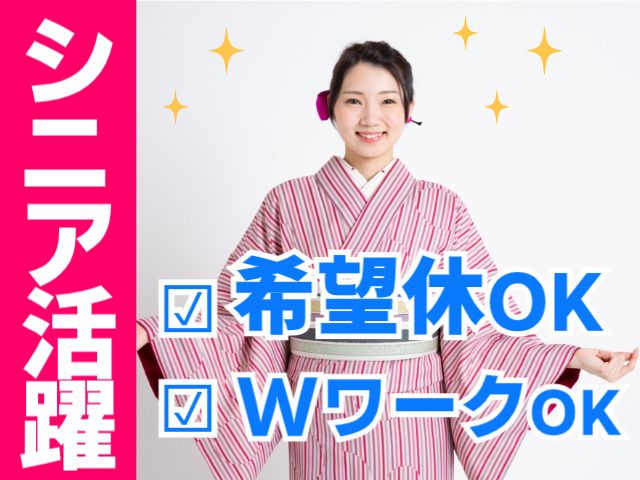仕事内容 【典雅きもの学院スタッフ募集!】 「着付けはできるけど指導は未経験」 という方も大丈夫! 1から丁寧に指導します。 「おすすめポイント」 ・講師未経験OK ・週1回~、1日120分~勤務OK ・WワークOK ・50代~70代の女性が活躍中 【お仕事内容】 初心者(ふれあい)コースの先生として 生徒さんが一人で着物を着られるように 指導をお願いします。 「着物を着る機会を増やしていこう」 「楽しい仲間ができる場所」 生徒さんにそう感じていただけるように 丁寧に指導していただきます。 【講師経験・流派は不問です!】 着物が好きな方、着付けの経験がある方、 未経験でも講師にチャレンジしてみたい方、 ぜひご応募ください! 【週1回~、1日120分~勤務OK】 スキマ時間に働ける! Wワークにもおすすめ! 希望休取得も可能ですので、 時間や日数はお気軽にご相談ください。 【50代~70代の女性が活躍中!】 ミドル中高年・シニア世代が多数在籍! 子育てが少し落ち着き、時間が出来始めた方や 今後長く続けられる事を新しく始めたい方など、 ぜひご応募ください! 【講師未経験者もOK!】 講師未経験でも着付けができればOK。 趣味や普段の着付け経験を活かせます! 【こんな方におすすめ!】 ・着物が好きな方(興味がある方) ・自分で着付けができる方 ・家事や育児の空いた時間で働きたい主婦(夫)さん ・子育てが落ち着いたからまた仕事がしたい 近年、着付けができる方が減少傾向にあります。 着付けの流派にとらわれず、着物が大好きで 着物の魅力を伝えたい、そのようなお考えの方は ぜひ、一緒に日本の大切な文化を広めていきませんか? 生徒さんが一人で着られるようになれば、 その喜びを一緒に感じられるやりがいあるお仕事です。 現在、50代・60代・70代の女性が多数活躍しています。 着物が好きな方、ご応募お待ちしております!